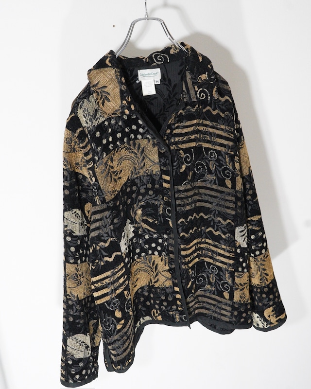 いわゆるタペストリー柄。 数ある柄物Snap-Tの中でも かなり着回しやすい印象。 揺らぎのある幾何学的な模様と 色の滲みが醸し出し、 全体的なファジーの印象を与え 自然の揺らぎの芸術性と機能性の 交差点にいるような個体です。 クラシックに落とし込む事もできたり、 当時らしくストリートシーンを 彷彿とさせるような着方もできる万能君です。 サイズもMとジャストで綺麗に着れる形。 これは推していきます。 SIZE:M model:175cm 実寸 着丈 : 約65.0cm 肩幅 : 約52.0cm 身幅 : 約56.0cm 袖丈 : 約58.0cm ~condition~ A:目立った傷や汚れなし B:やや傷や汚れあり C:傷や汚れあり [A] 軽い使用感のみ 取り扱い店舗 memento 下北沢店 ※店頭と在庫を共有しておりますのでご購入後に欠品の場合がございます。 また、お支払いの処理が完了した時点で店頭から在庫を確保いたしますので、入金待ちの段階では店頭併売中となりますのであらかじめご了承ください。 ※商品の素材等よっては実寸表記に若干の誤差が生じる場合がございますのであらかじめご了承ください。