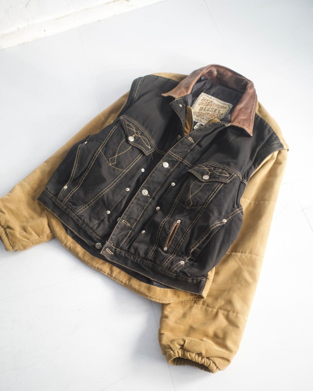本当に良い意味で頭の悪〜い服です。 改めてイタリアンカジュアルを 先導していたブランド、 というのを深く感じましたね。 オンスの薄めなブラックデニム地に、 袖やバックはコーデュロイのキルティング。 ジップ+刻印入りのボタン。 同じく刻印入りのリベットに、 不思議な位置に配したコインポケット。 襟と同様にレザーでの玉淵仕様も、 妥協の一切無いデザインといえます。 更に上記した"頭の悪〜い"意味は、やはり袖。 取り外し可能で ベストにもなっちゃうんですよ〜。 本当に大好きです。 size:XL model:175cm 実寸 着丈 : 約68.5cm 肩幅 : 約56.0cm 身幅 : 約66.0cm 袖丈 : 約62.5cm ~condition~ A:目立った傷や汚れなし B:やや傷や汚れあり C:傷や汚れあり [B] 首元のレザーに色落ち。また全体的に使用感のある個体です。 取り扱い店舗 memento 下北沢店 ※店頭と在庫を共有しておりますのでご購入後に欠品の場合がございます。 また、お支払いの処理が完了した時点で店頭から在庫を確保いたしますので、入金待ちの段階では店頭併売中となりますのであらかじめご了承ください。 ※商品の素材等よっては実寸表記に若干の誤差が生じる場合がございますのであらかじめご了承ください。