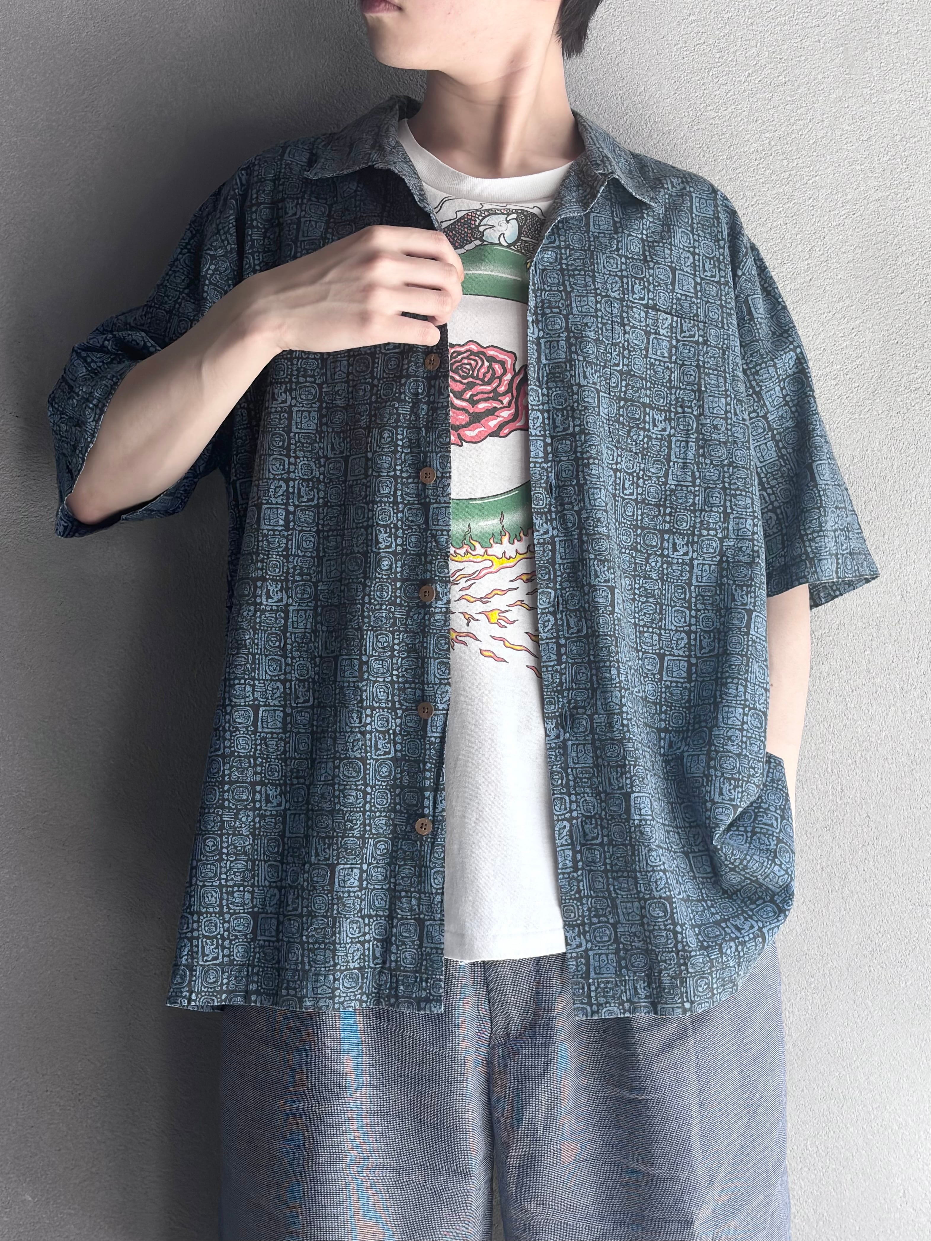 古代文字を思わせるプリミティブな総柄は、マヤやインカを想起させる民族意匠風。とはいえ本格的なトライバルではなく、あくまで都会的に、今に馴染むような、カジュアル化されたリゾートシャツの文脈でしょう。