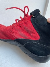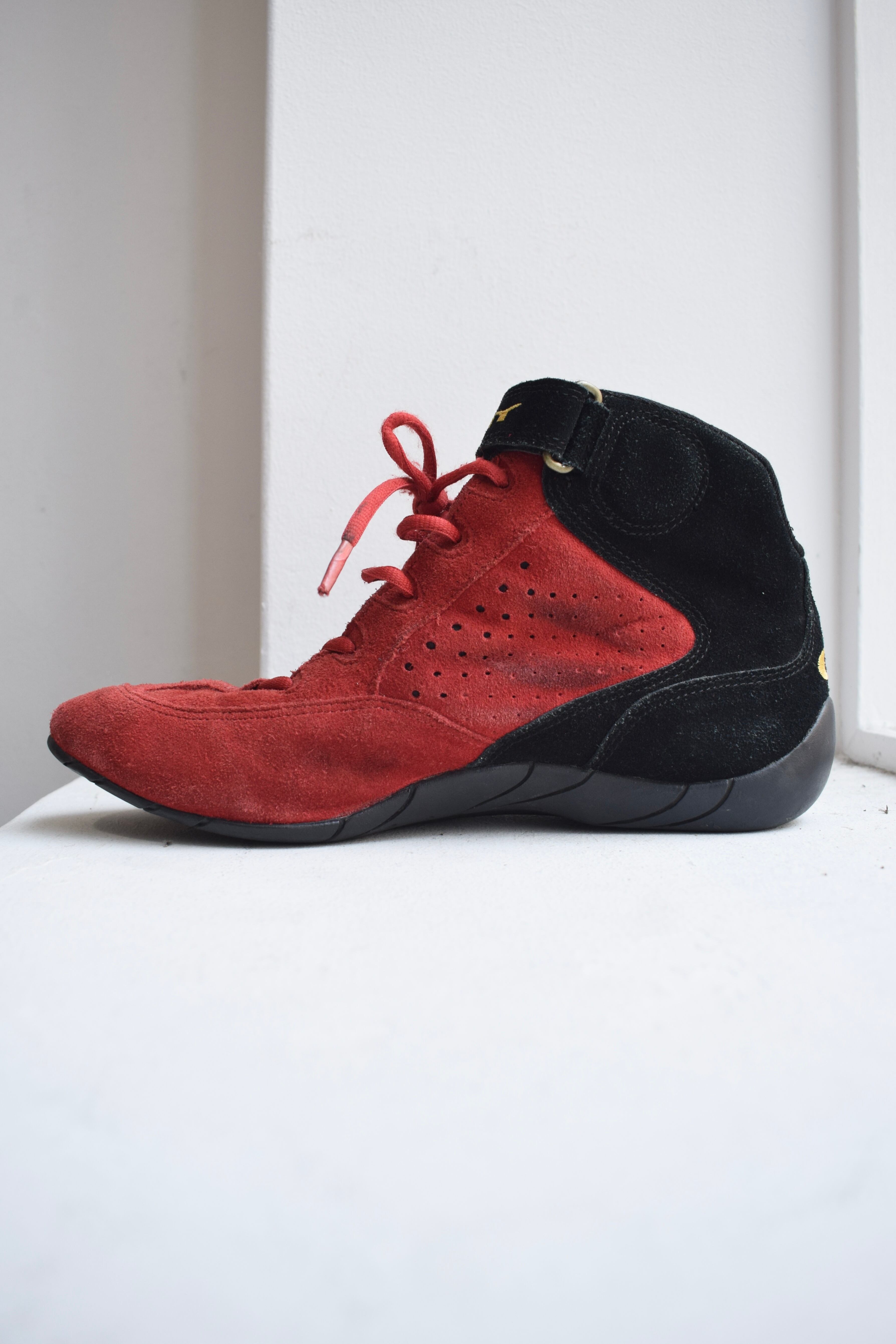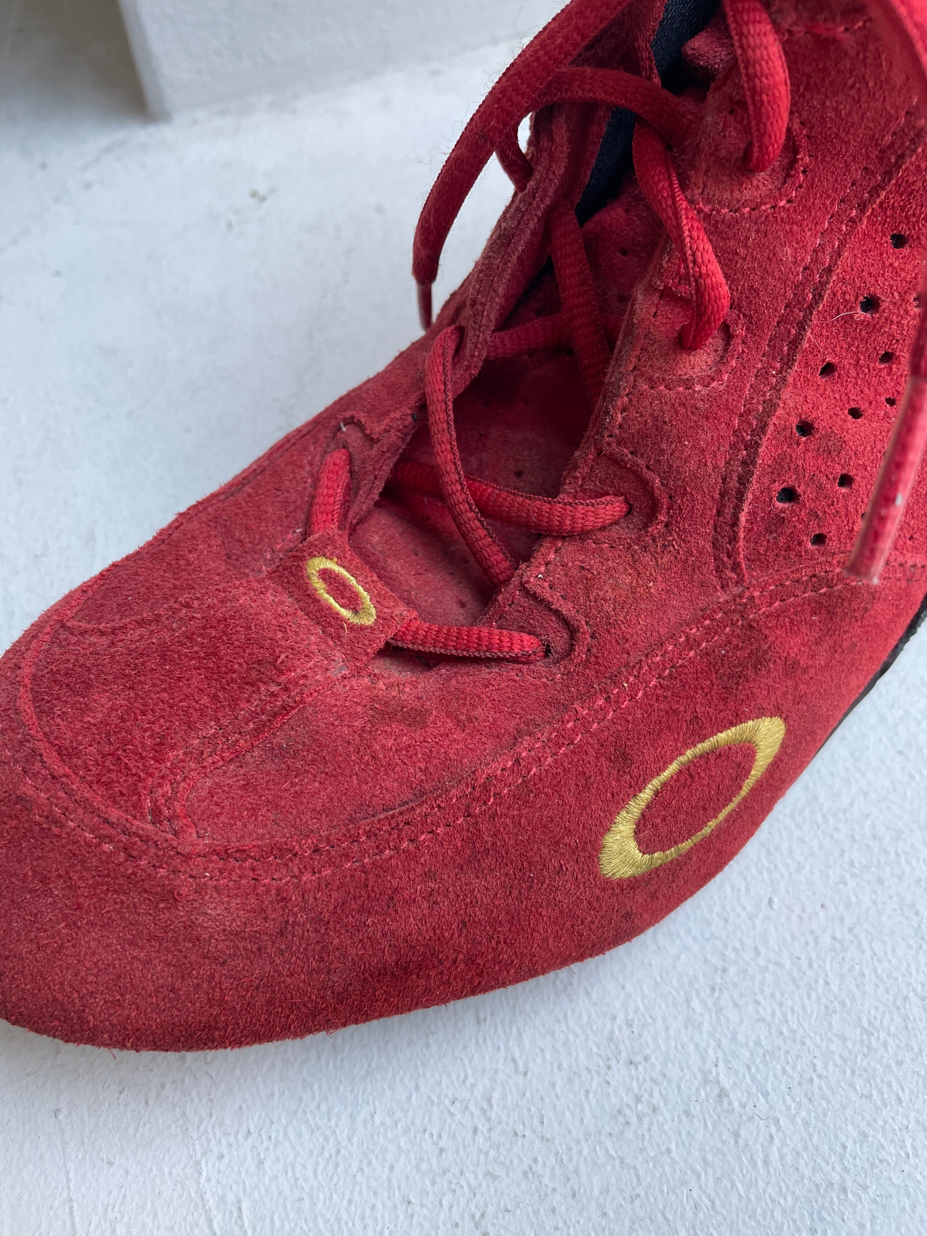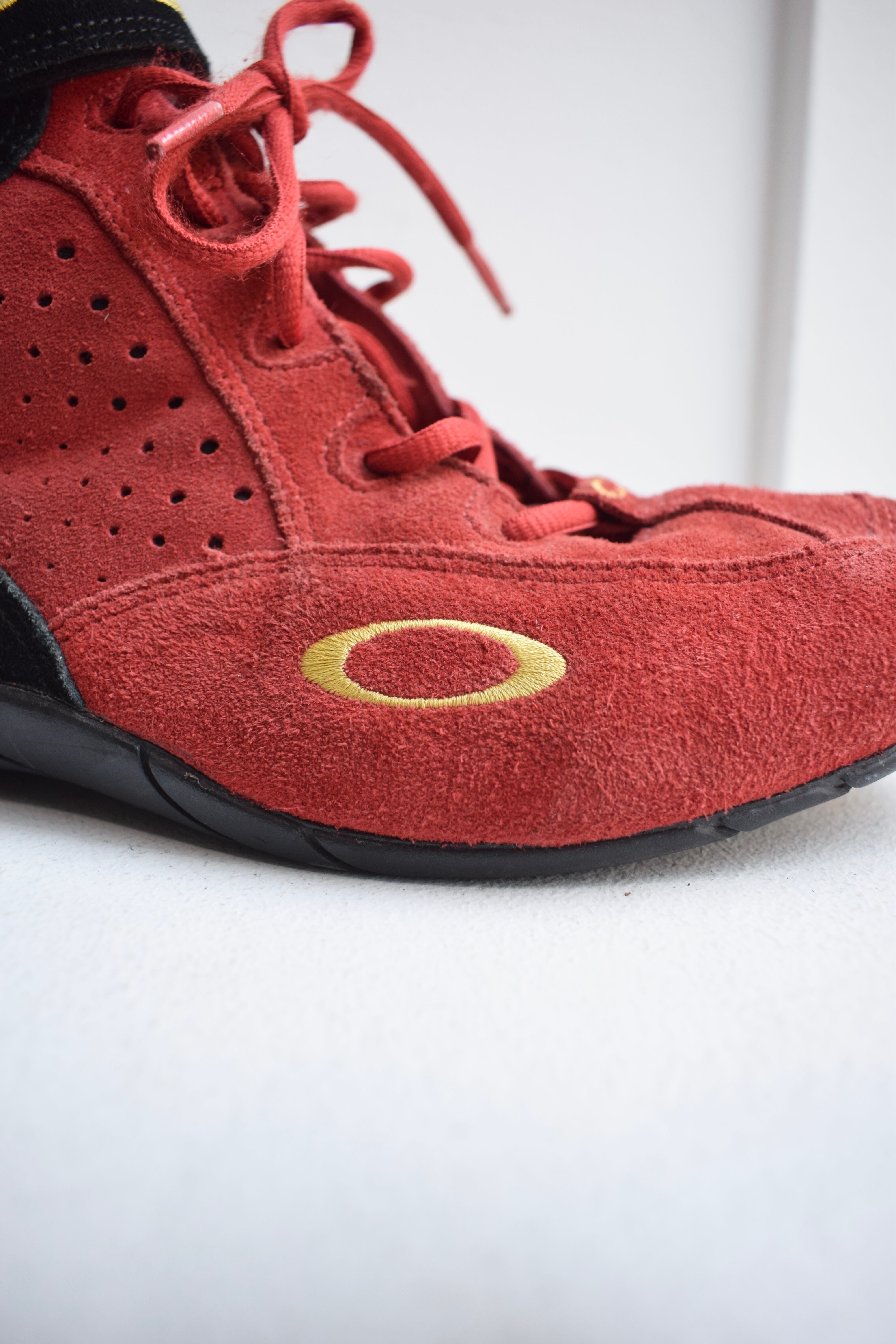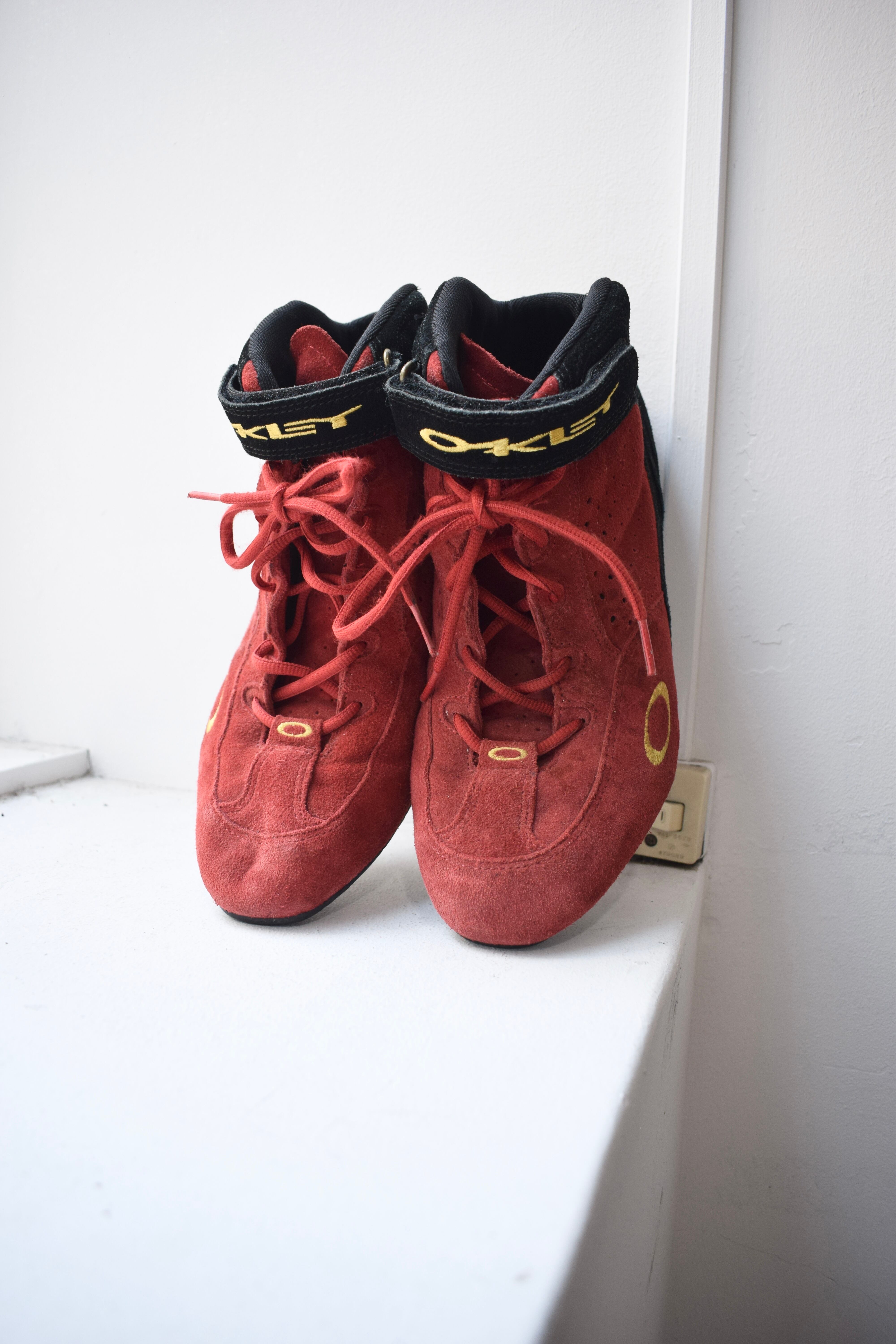 赤のスウェードが目を引くオークリーのレーシングシューズ。
