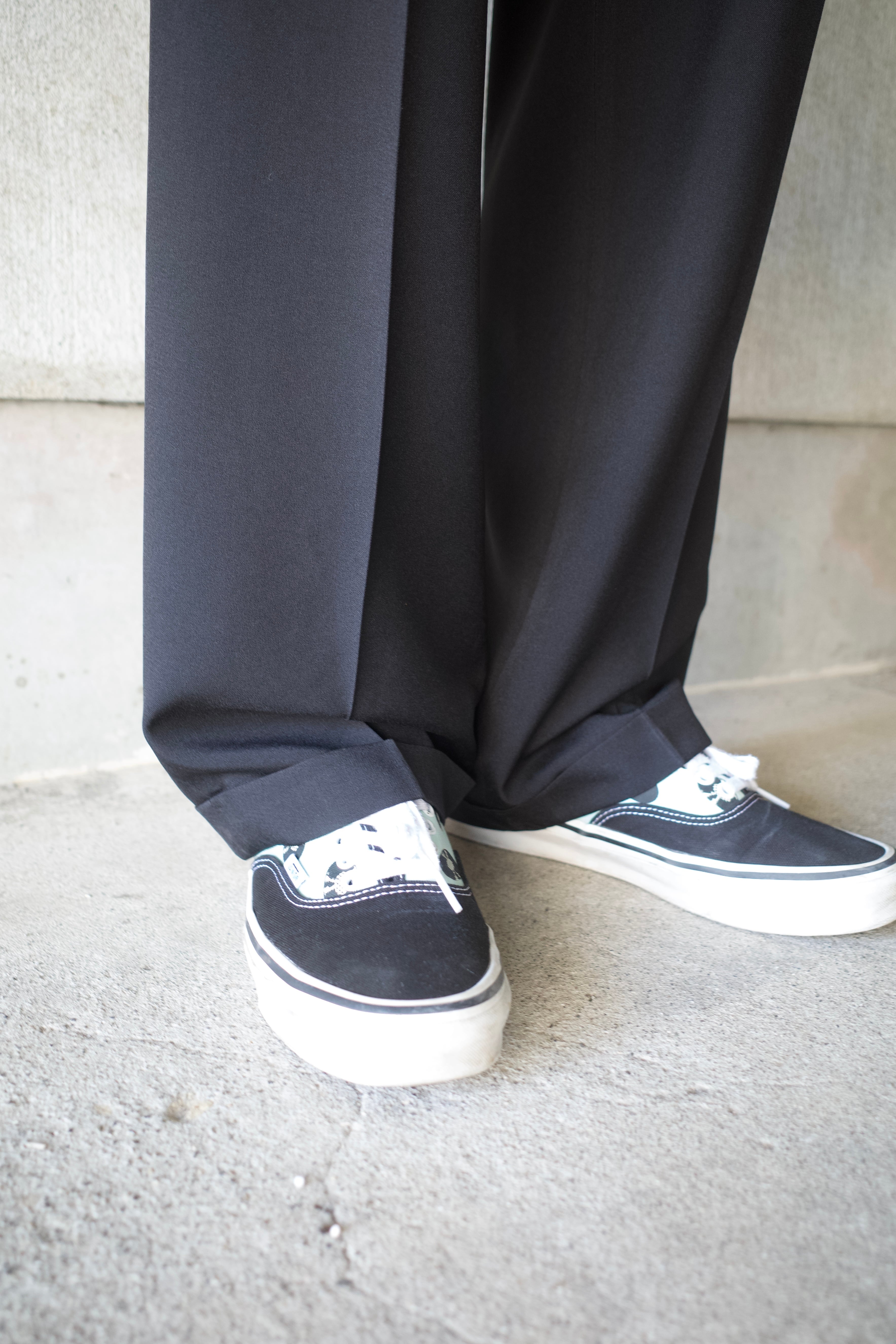 洗濯前提でのポリエステル素材。尚且つ大きく取られた2タック。裾はしっかりとダブル仕様であり、トラッドと利便性を共存させた個体ですね。