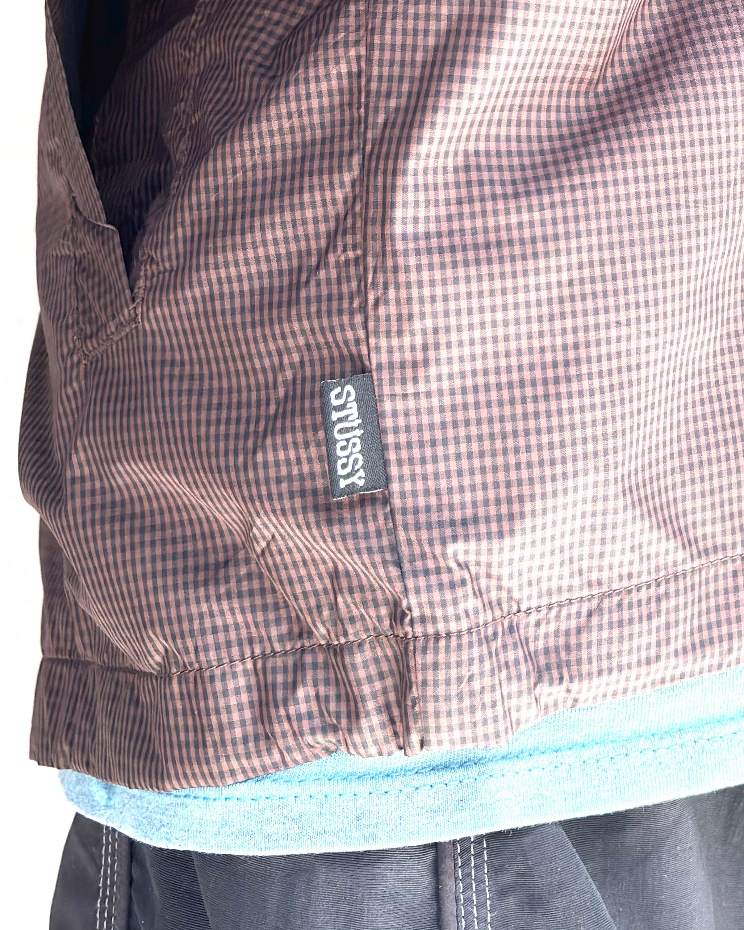 ブラック×ブラウンからなる、ギンガムチェックのポリエステルシェル。スナップボタンでの開閉と、胸にジップ付きのポケットを付け、ブランド主張は裾のピスタグへ。