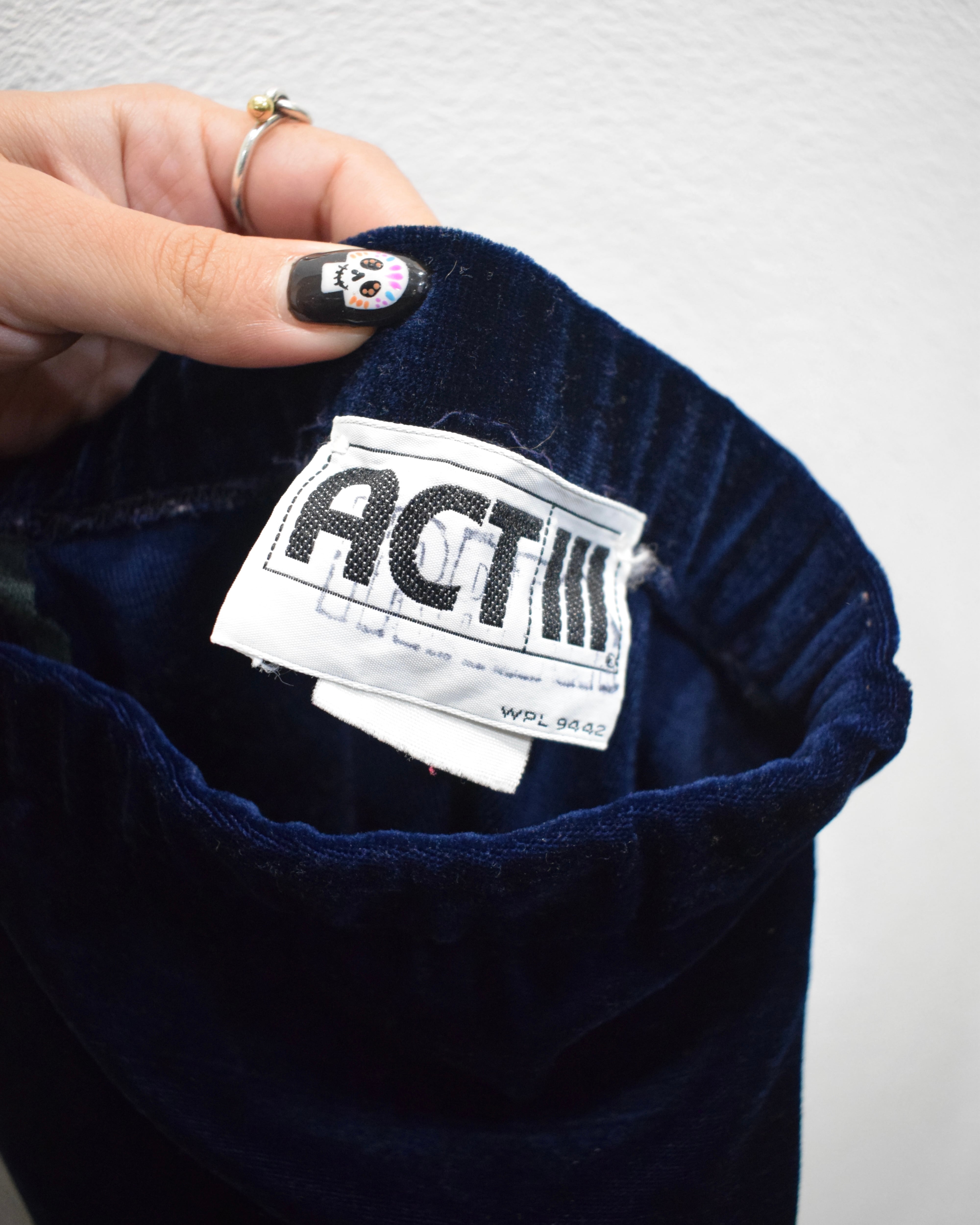 深いブルーのベロアパンツ。