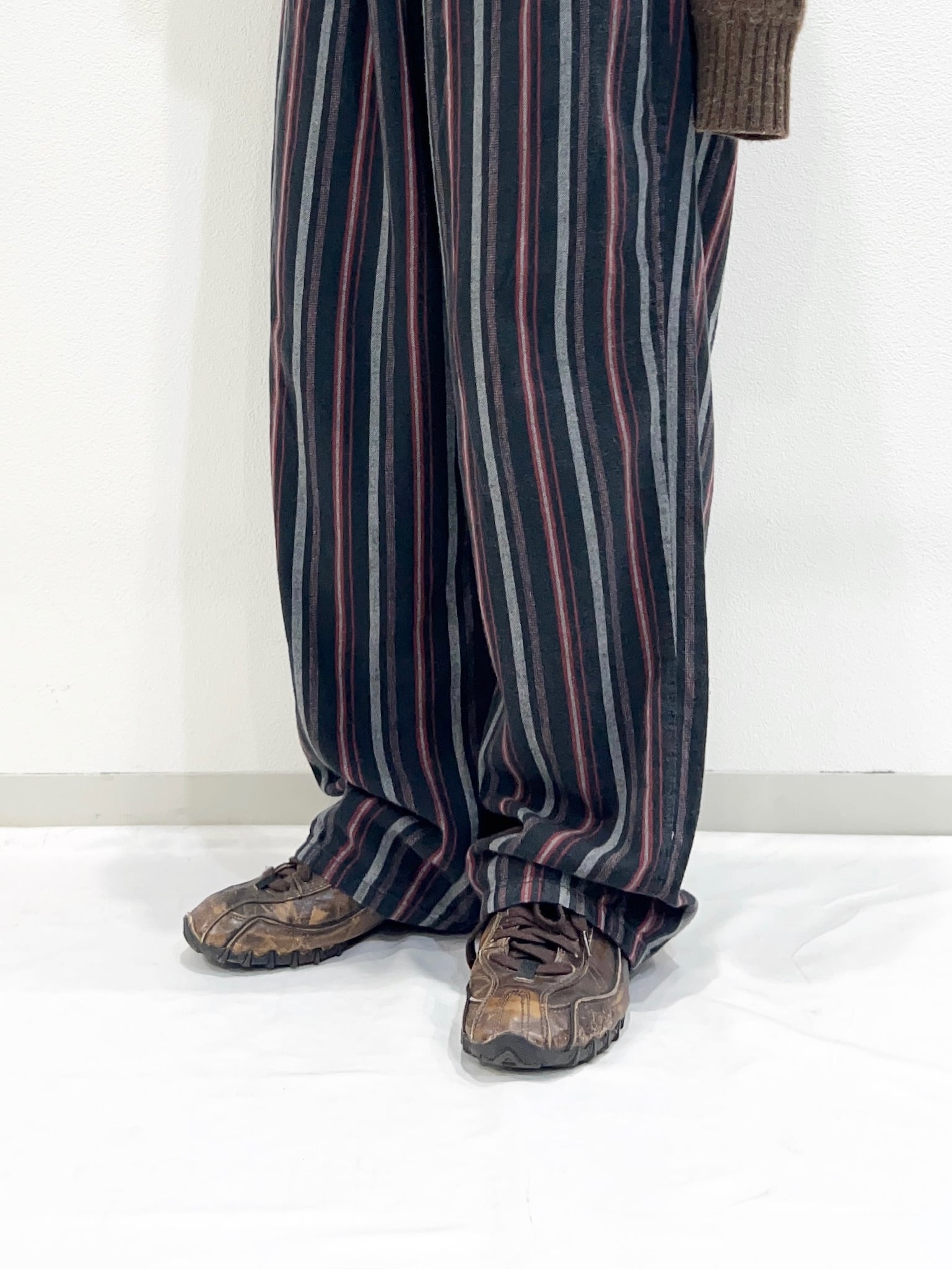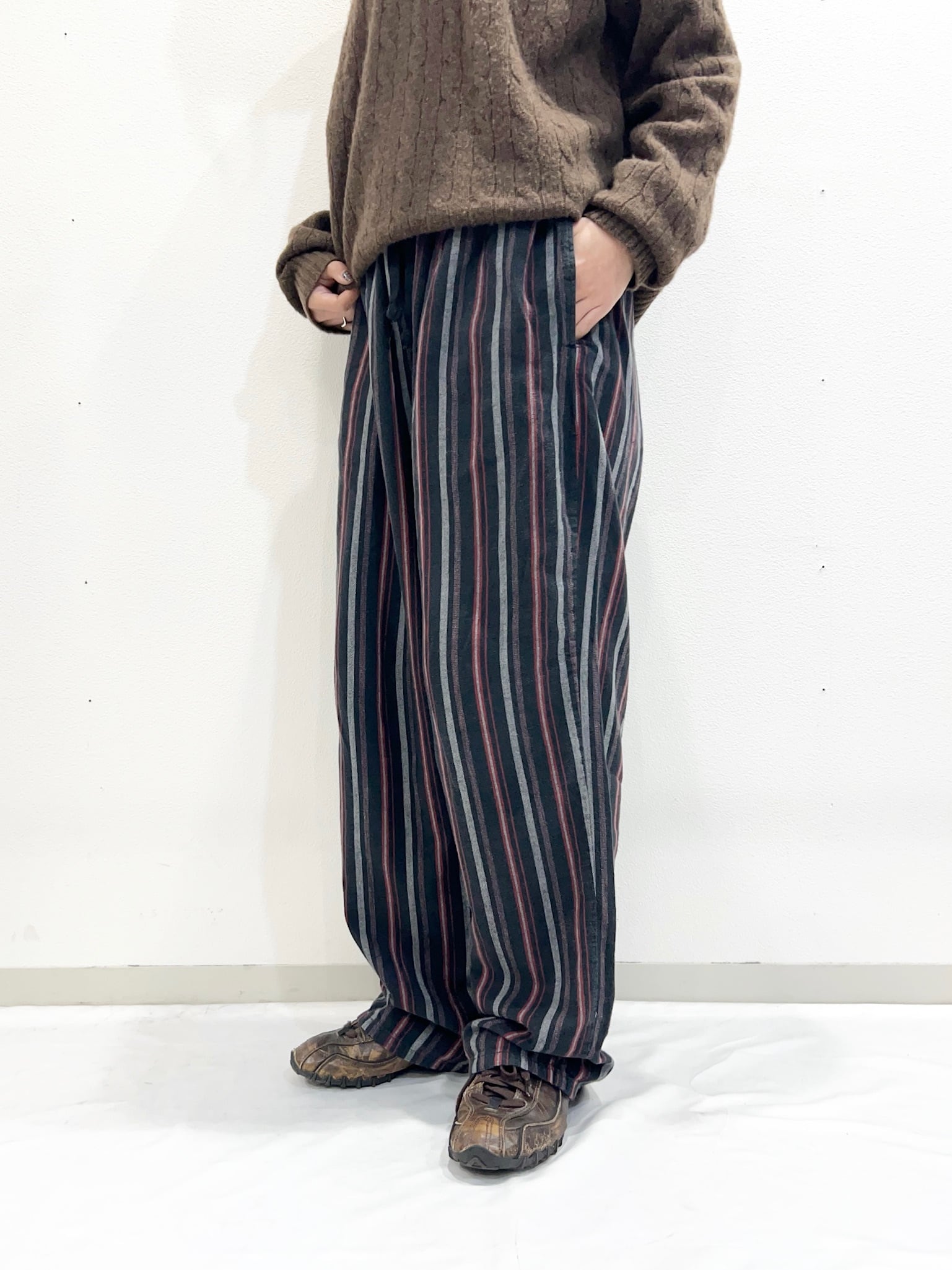 落ち着いたトーンのストライプで、リラックス感がありつつもだらしなく見えないバランスが魅力です。