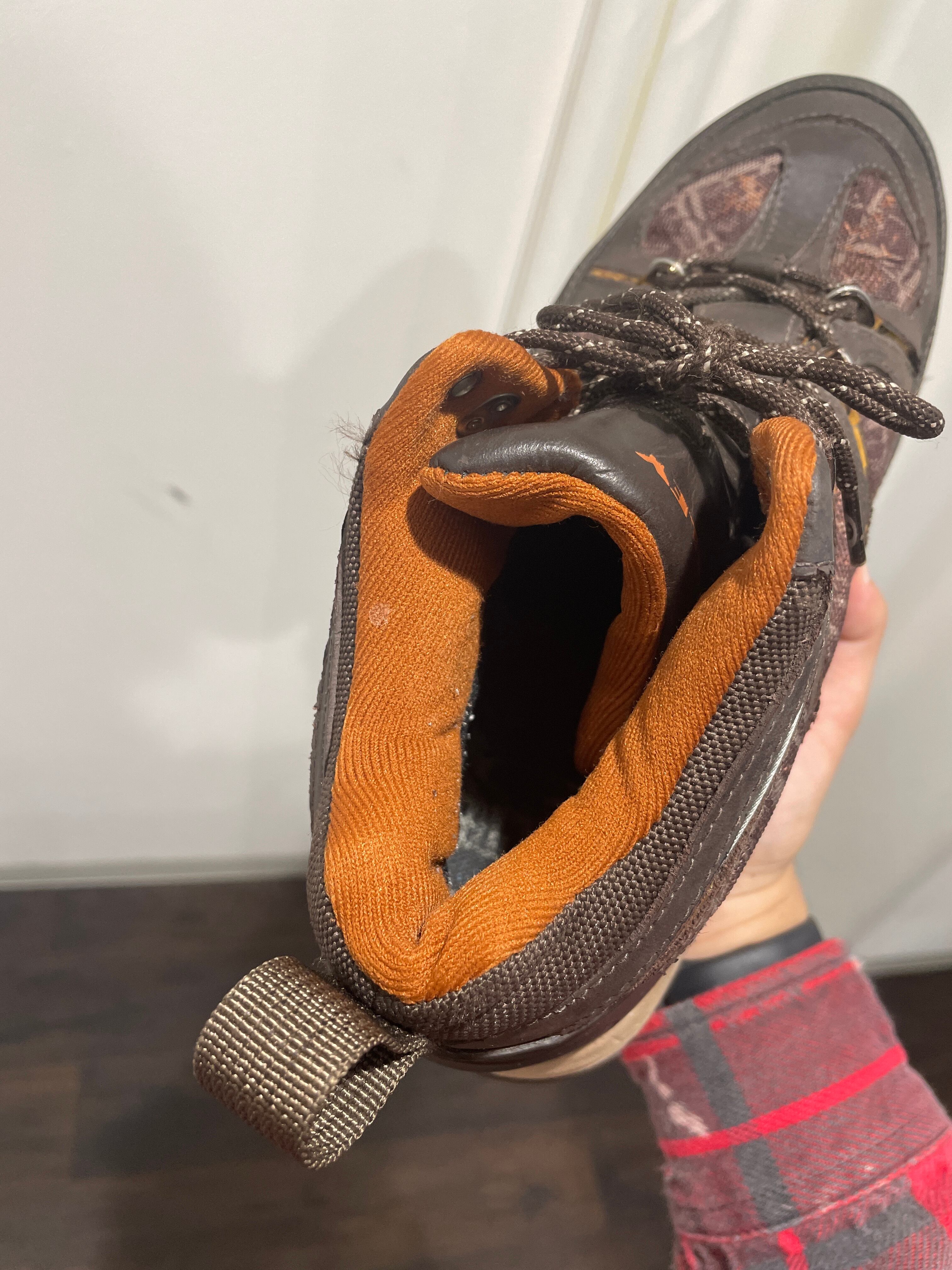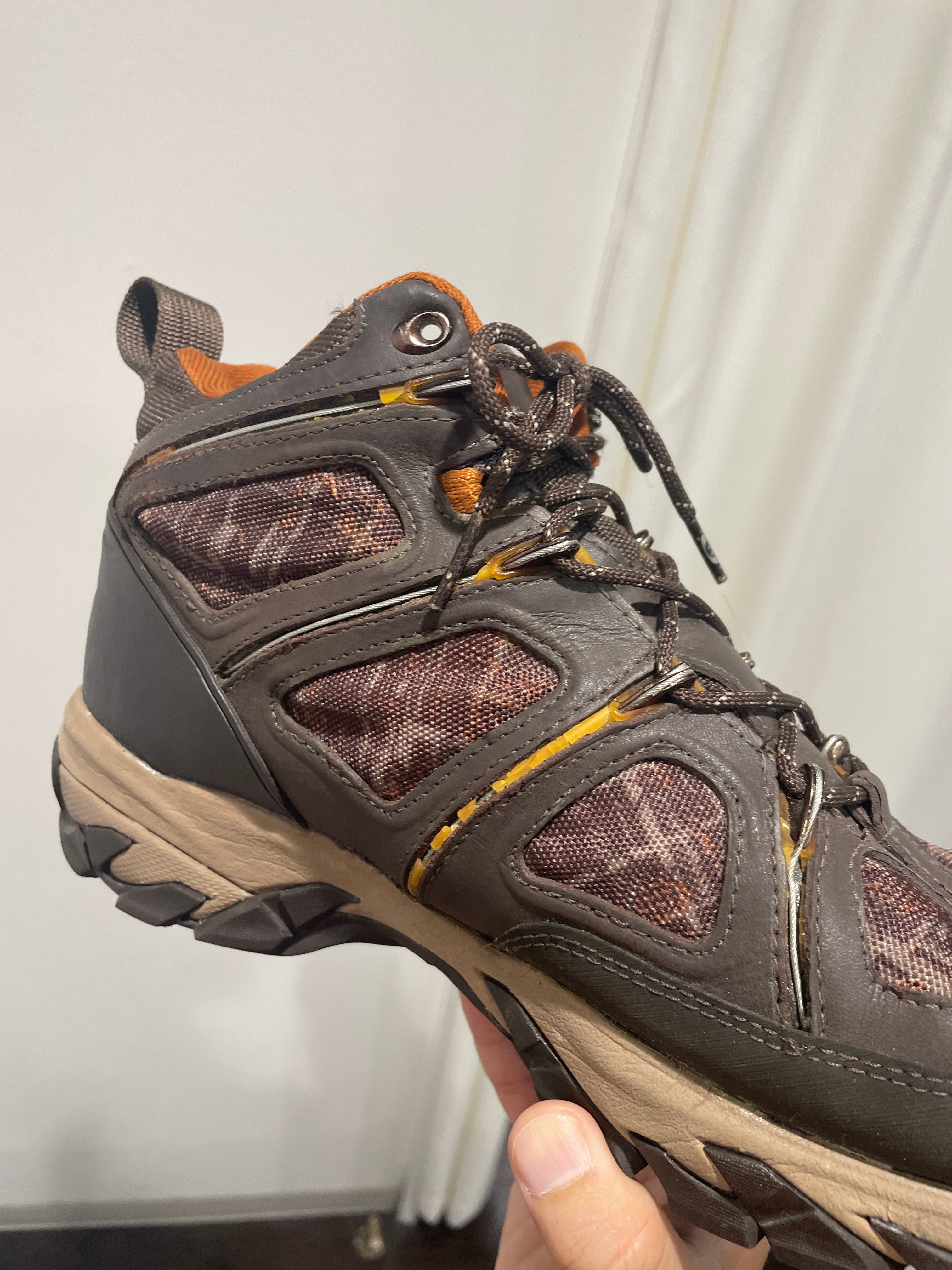 ブラウン×オレンジ×ベージュの可愛らしい配色のオークリーのトレッキングブーツ。