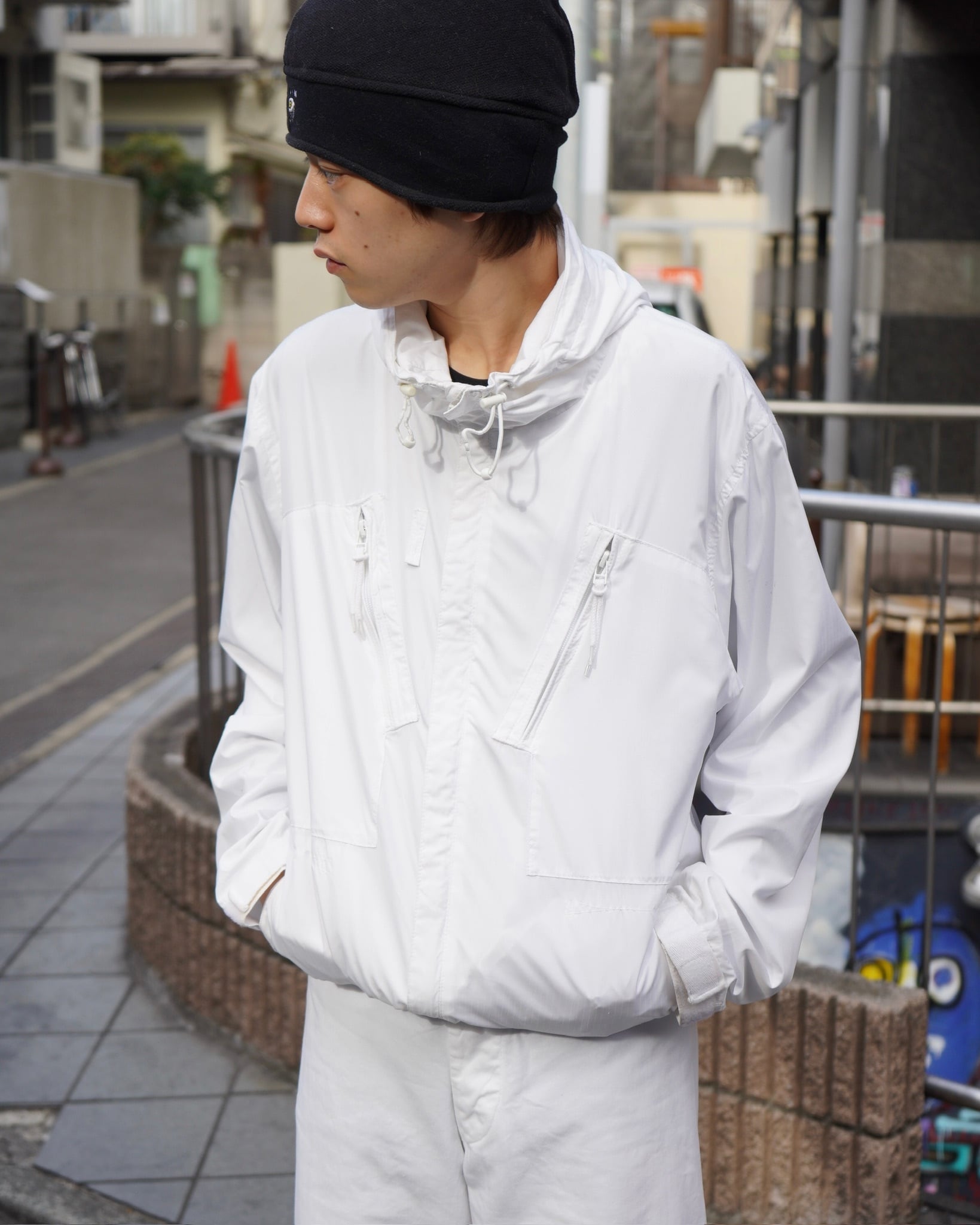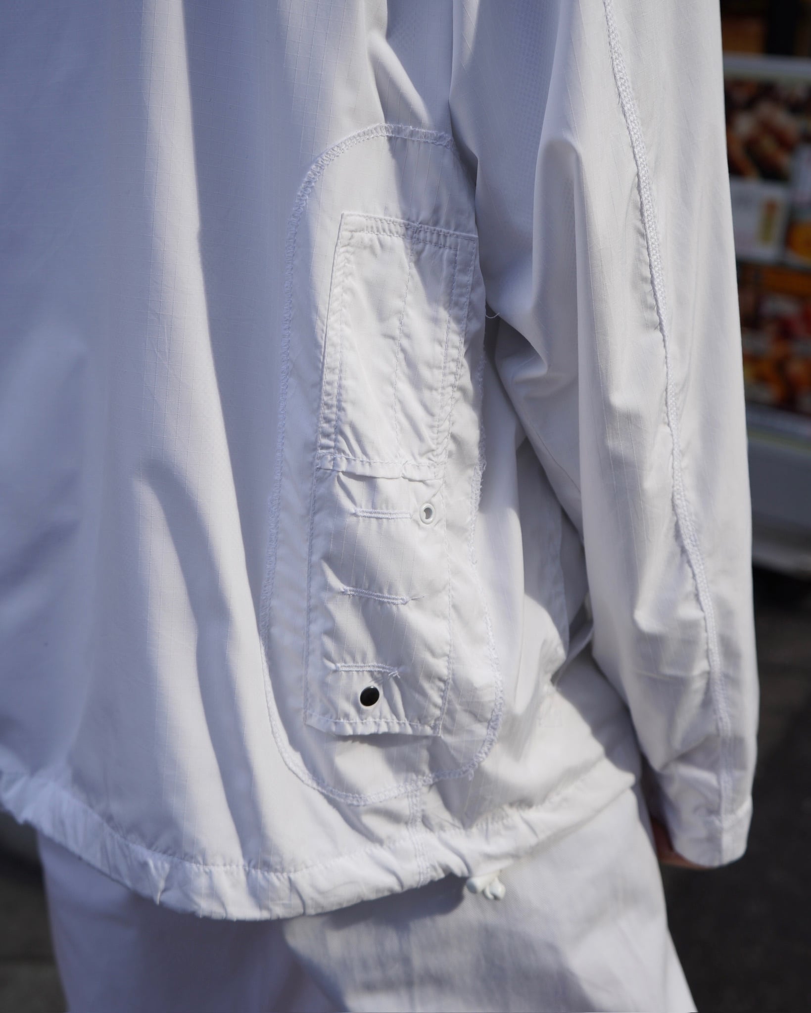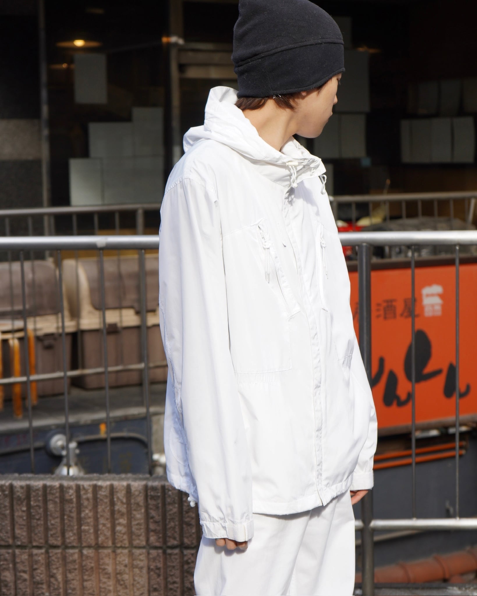 ゴム紐に若干の劣化。右袖にシミ汚れ。また他にも目立たぬ汚れ。背タグが擦り切れております。