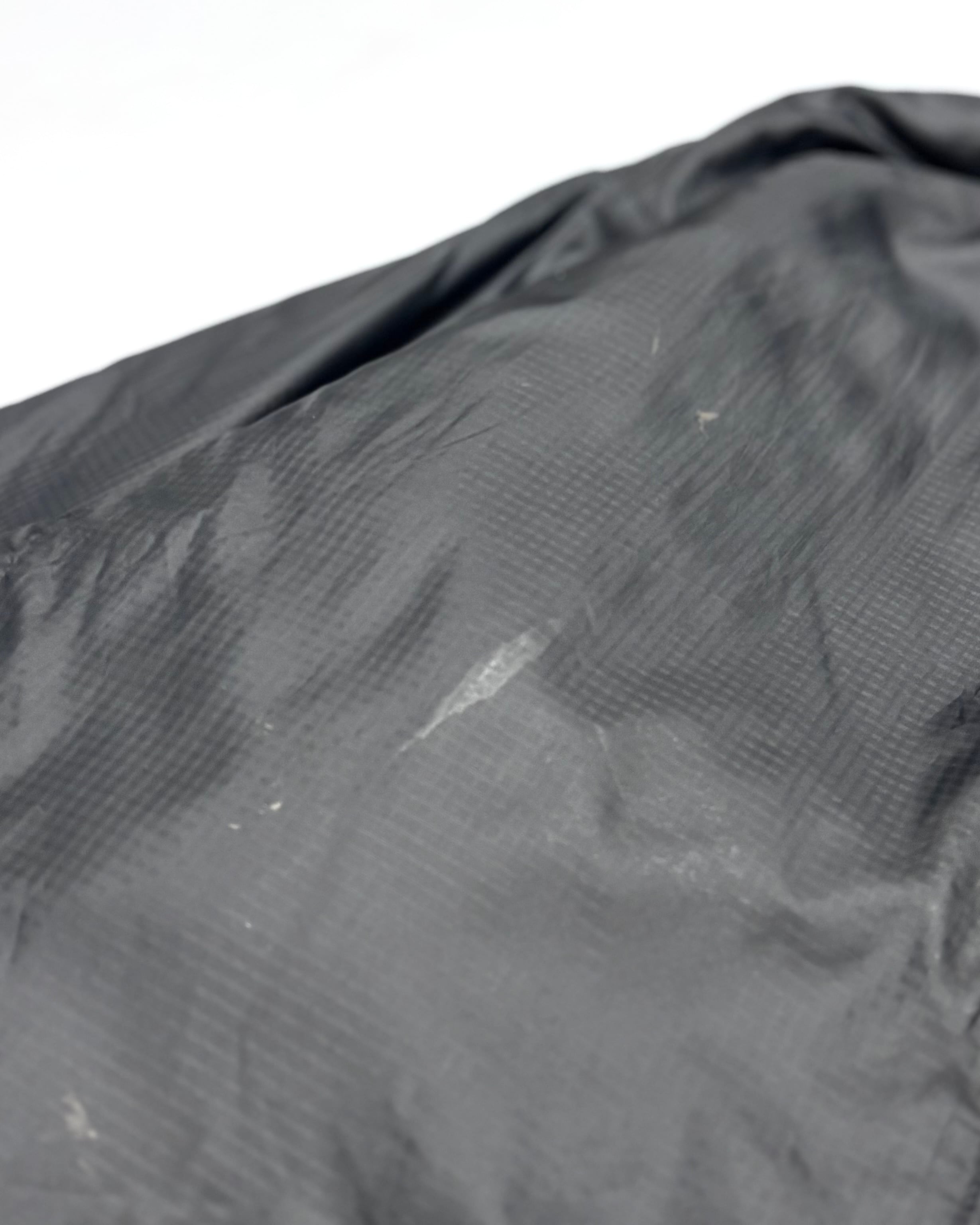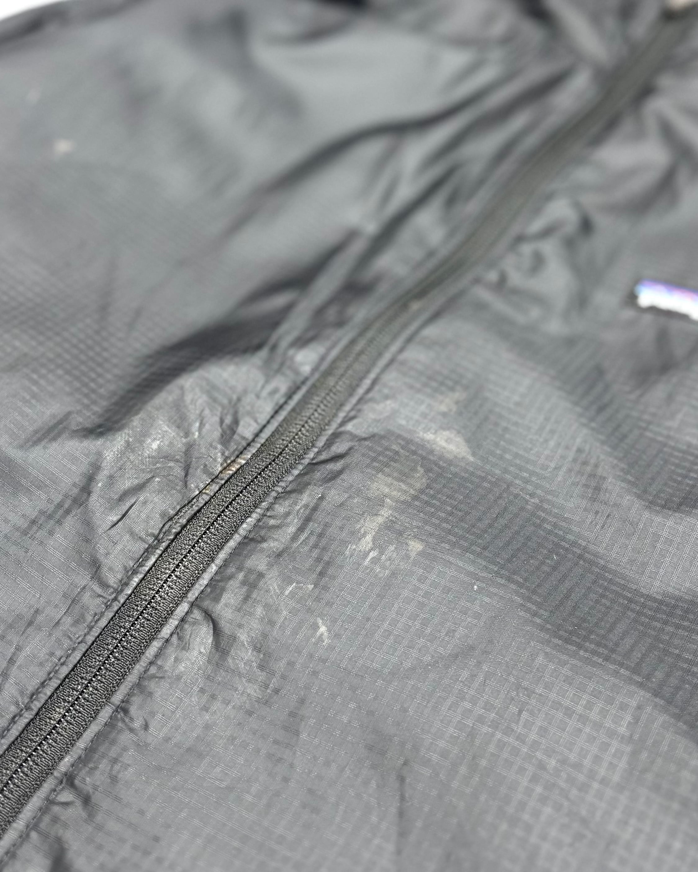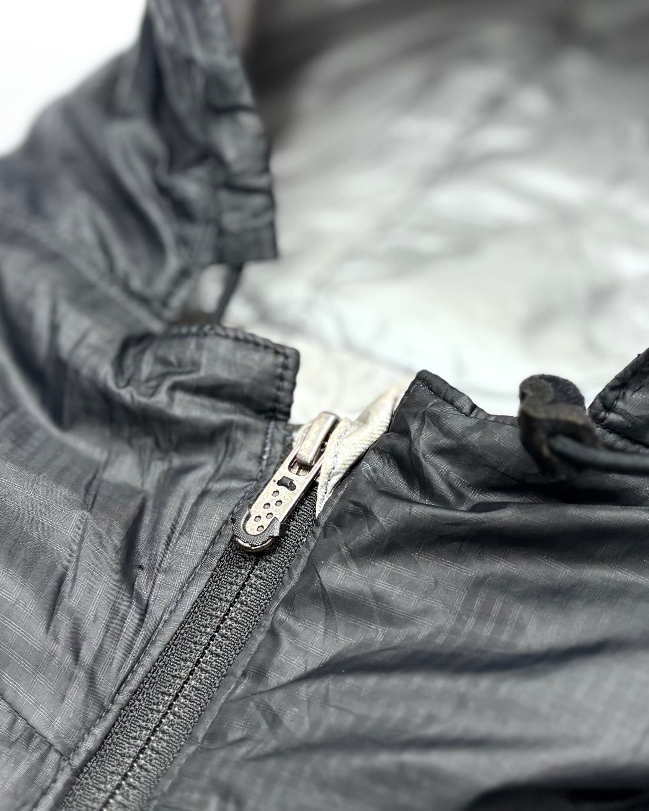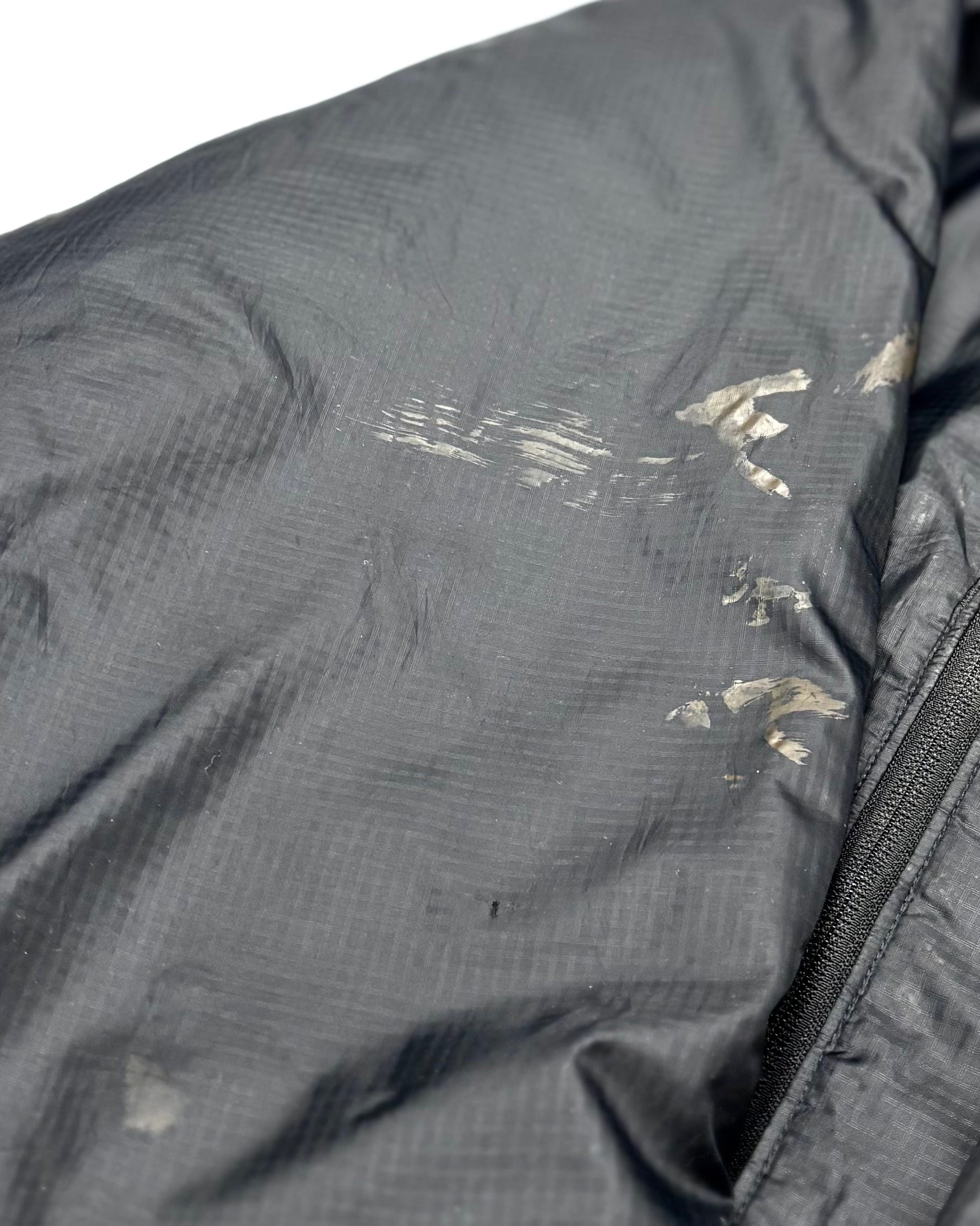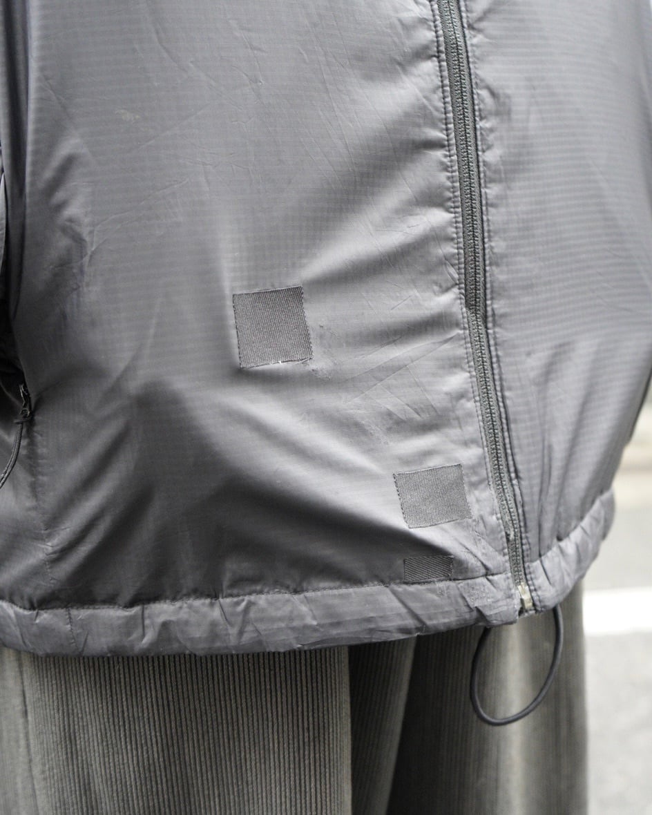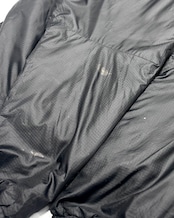 フロント裾に大きなリペア痕。裾ドローコードの留め具欠損。フード裏に若干の黄ばみ。ジッパーヘッドの割れや欠損。また各所に汚れがございます。