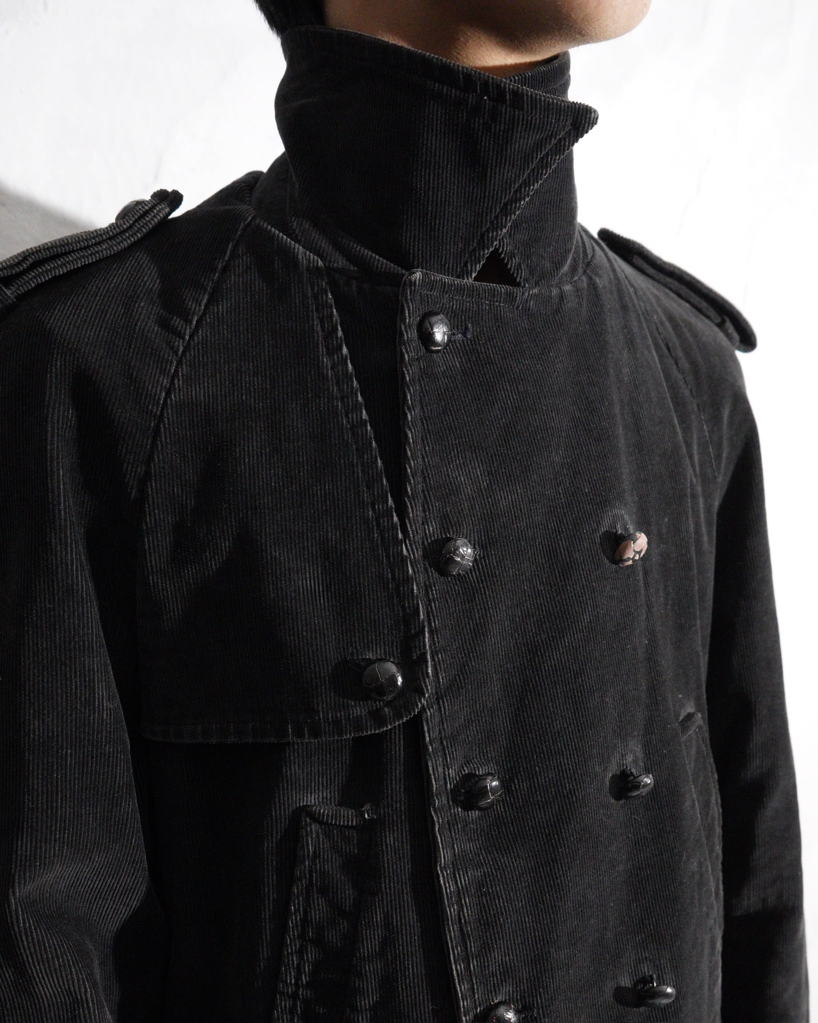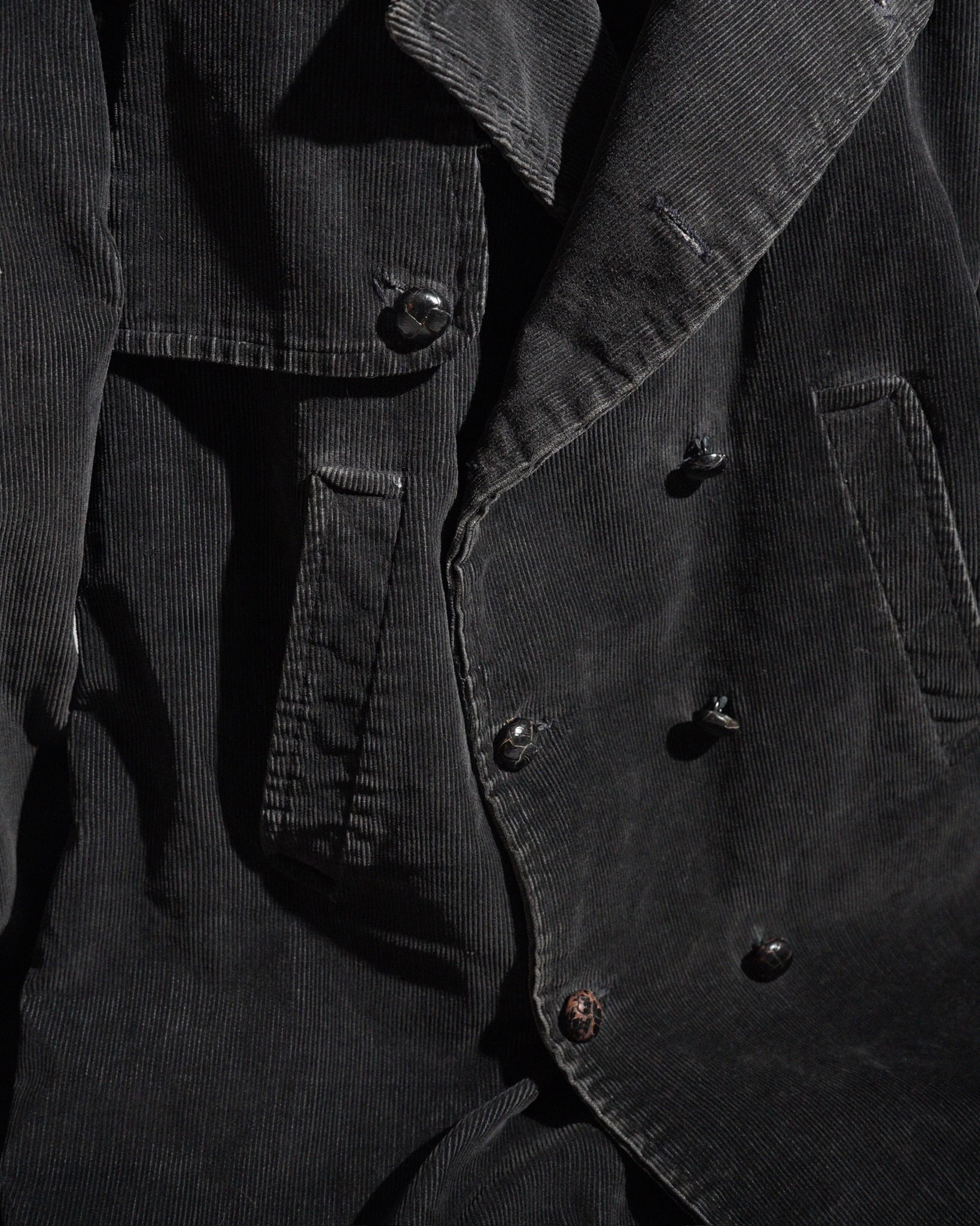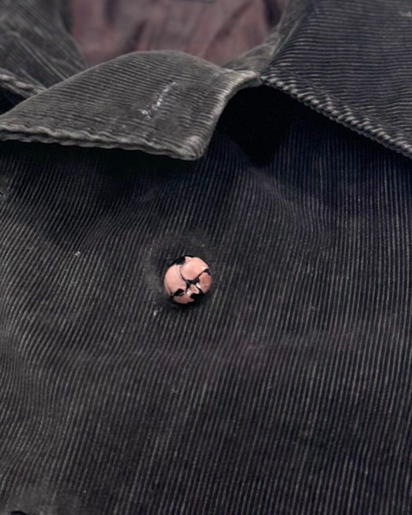 裏地の一部変色。また裏地裾に解れ。右ポケット上部に目立たぬダメージ。左のくるみボタンを中心に色落ち。全体に使用感がございます。