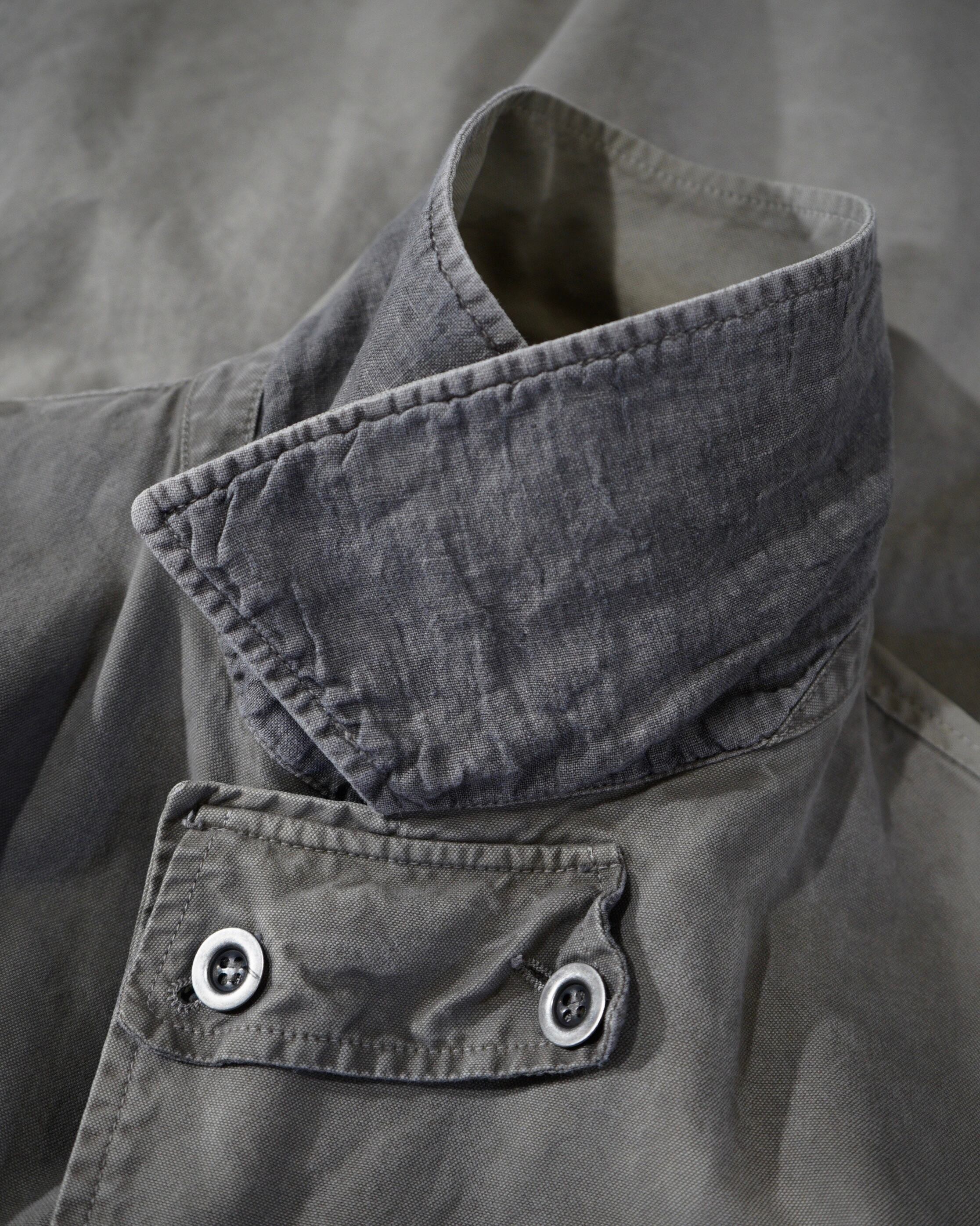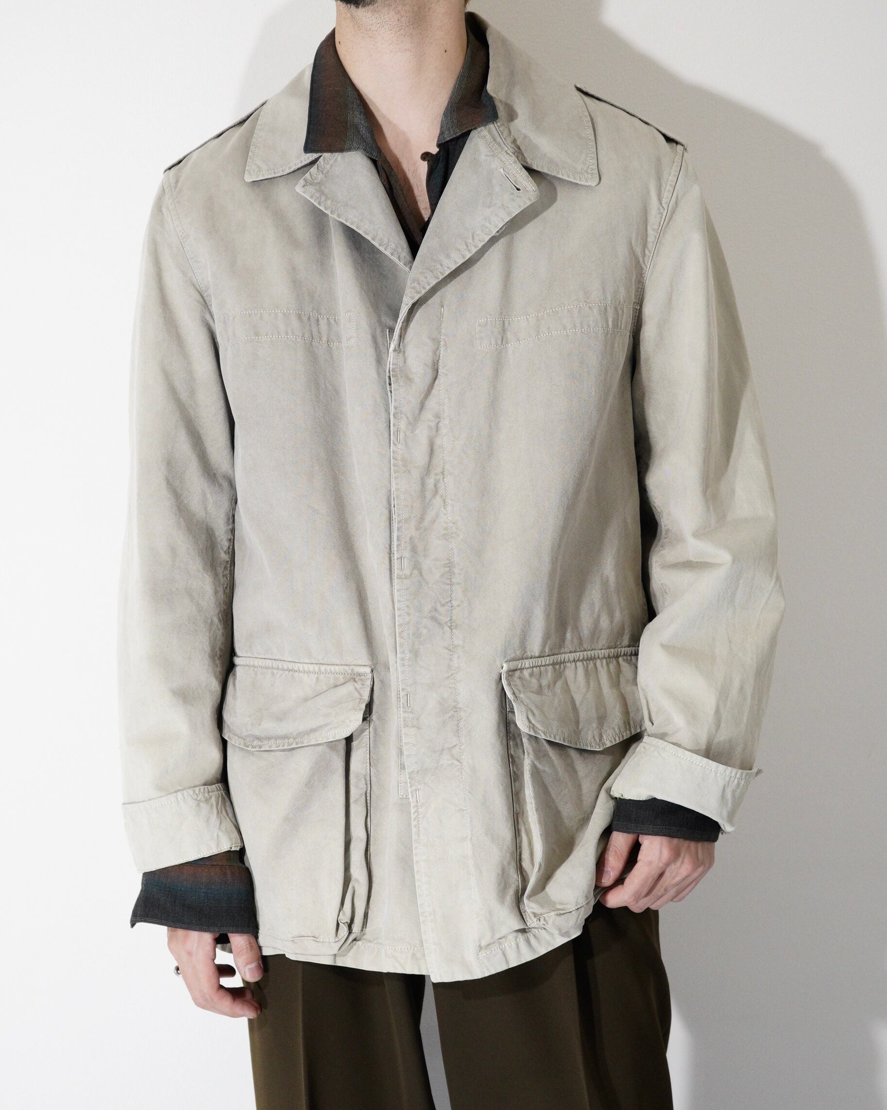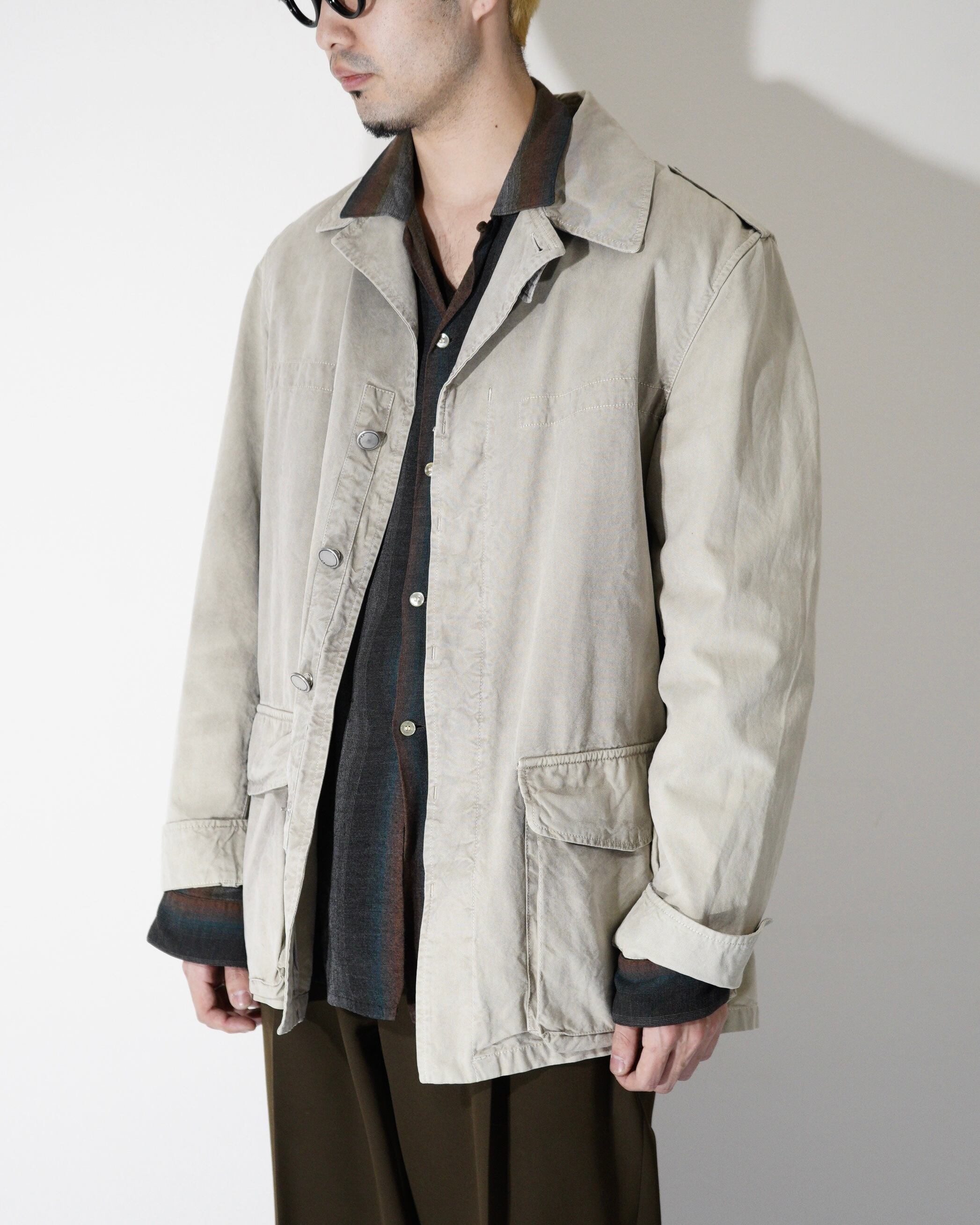 ミリタリー由来のジャケットを柔らかいコットンやリネン?で構築しており、無骨な印象というよりはラフに着用できるように昇華されてます。