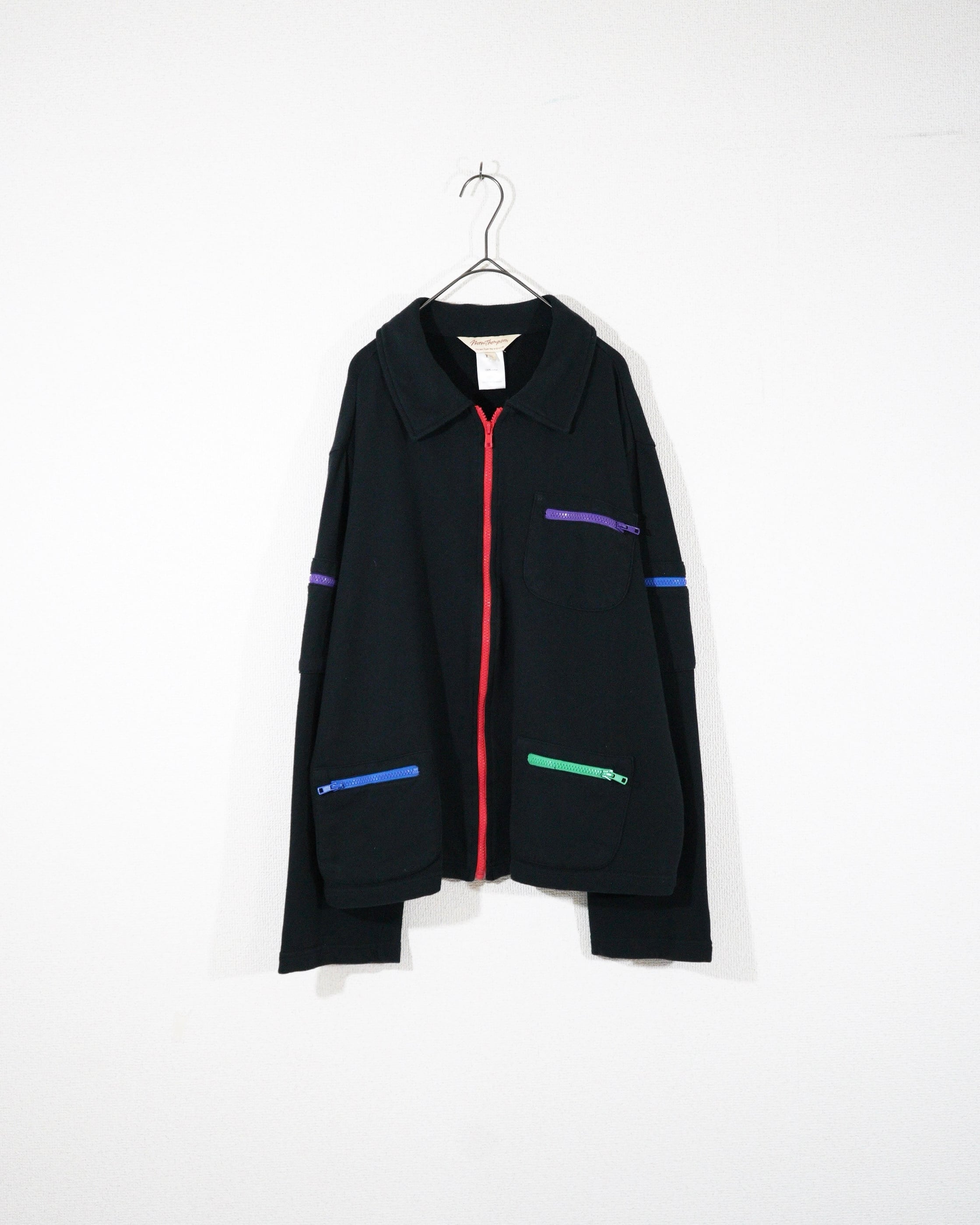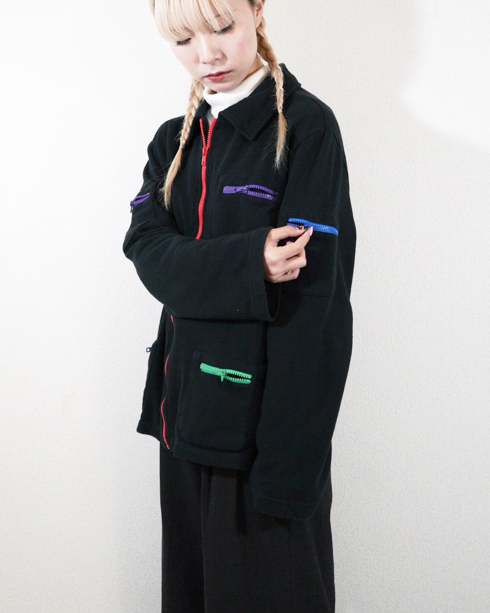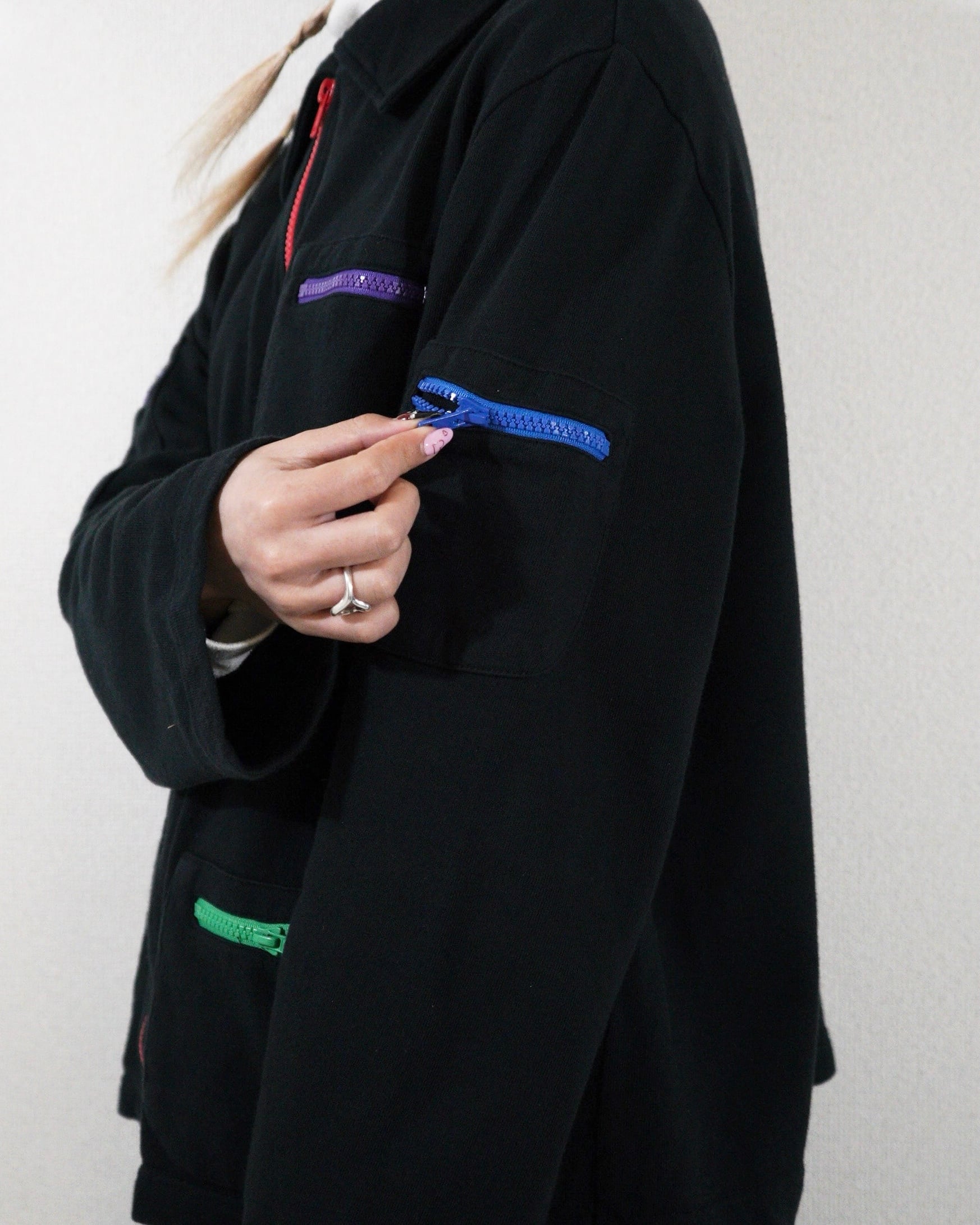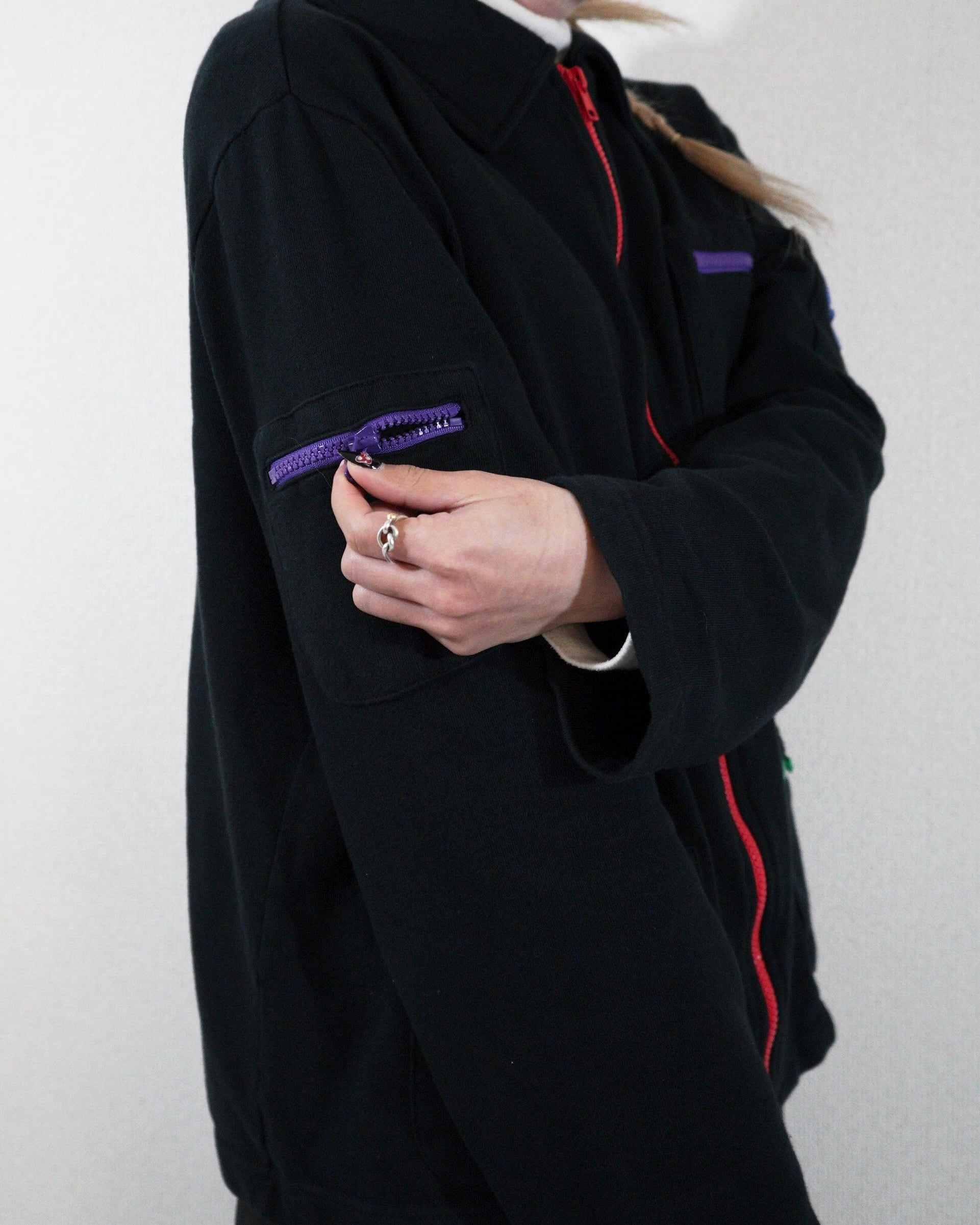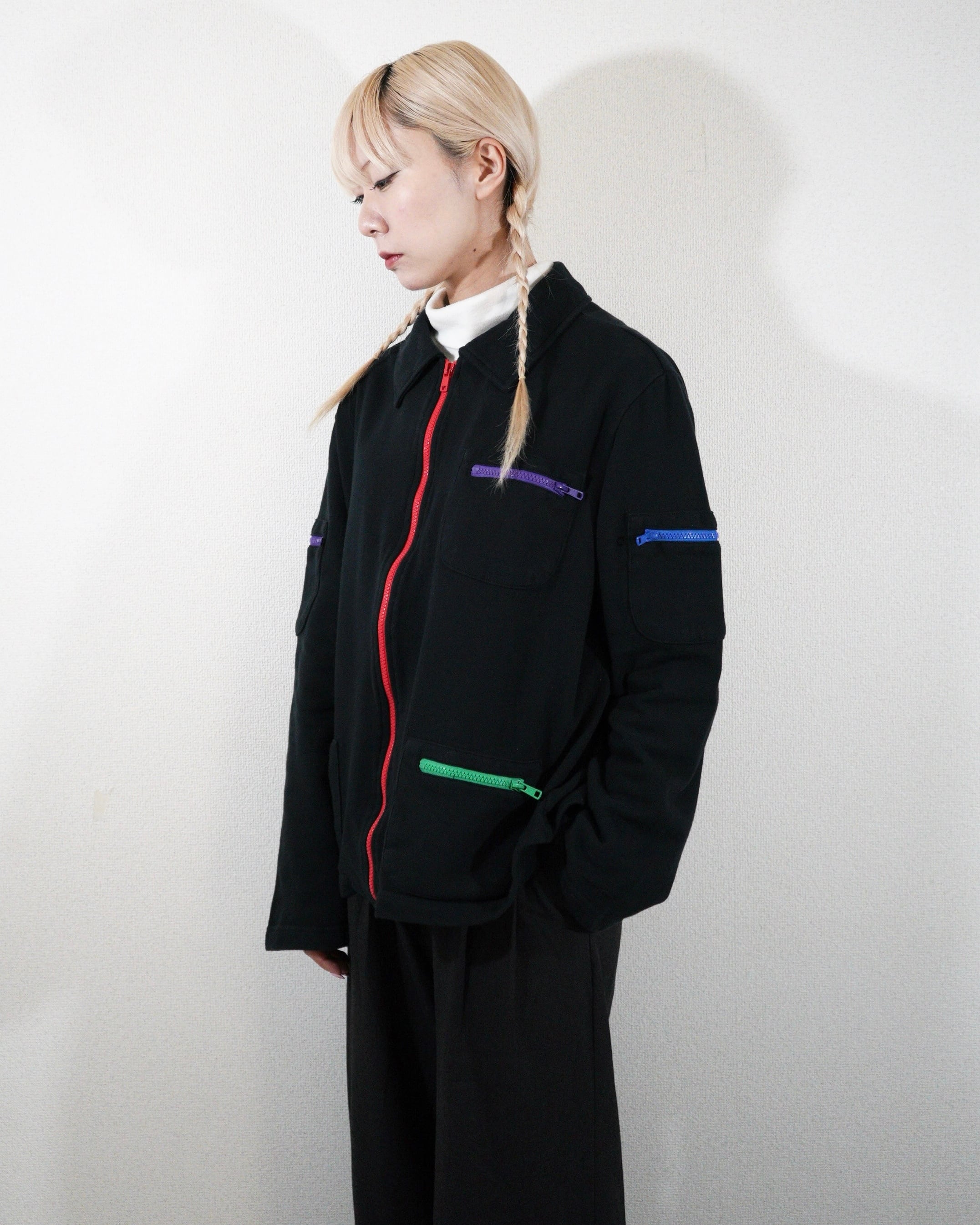 ただの黒のスウェットだとシンプルすぎるところを、カラフルなジップが付く事でアクセントになっています。
