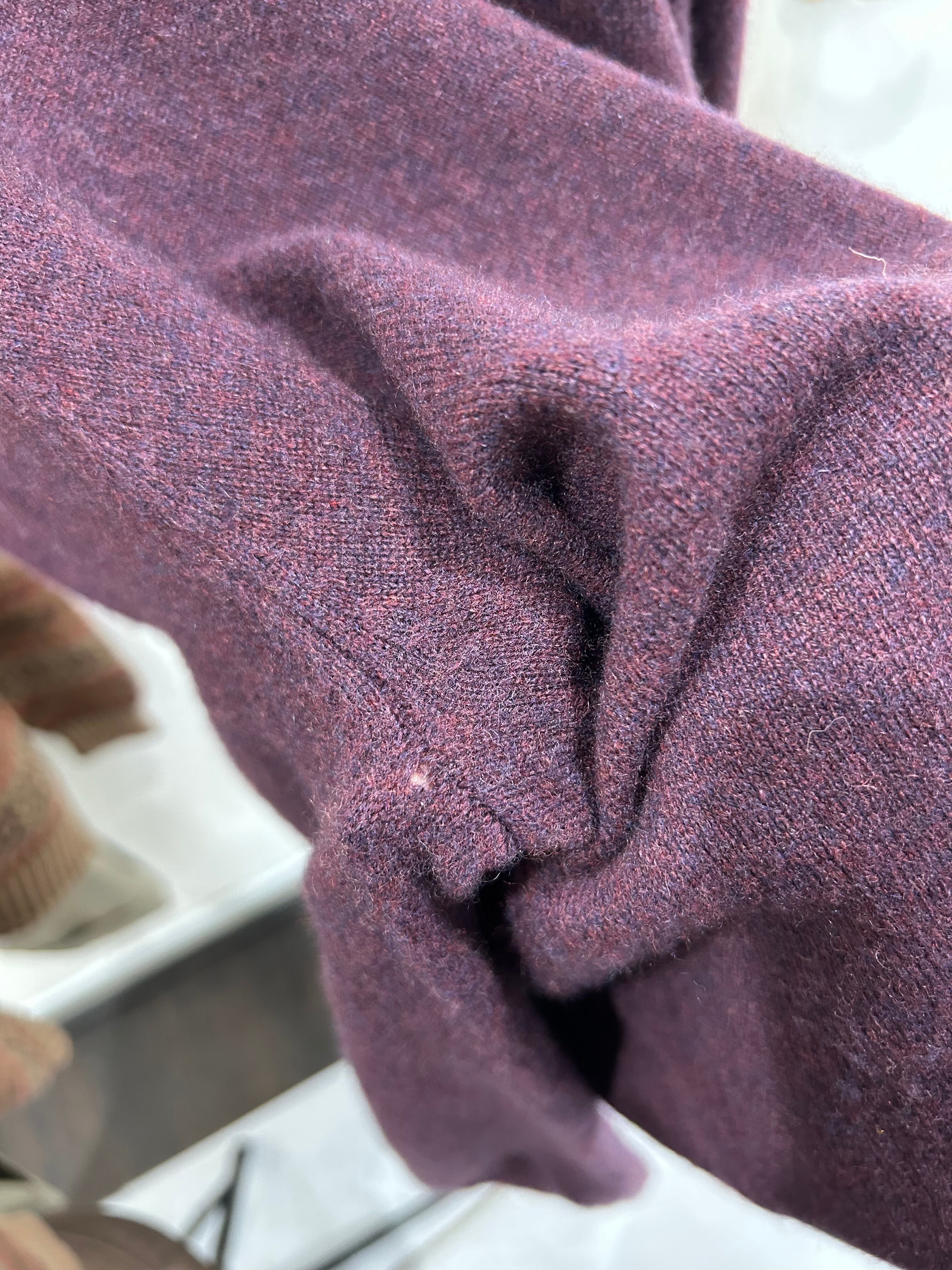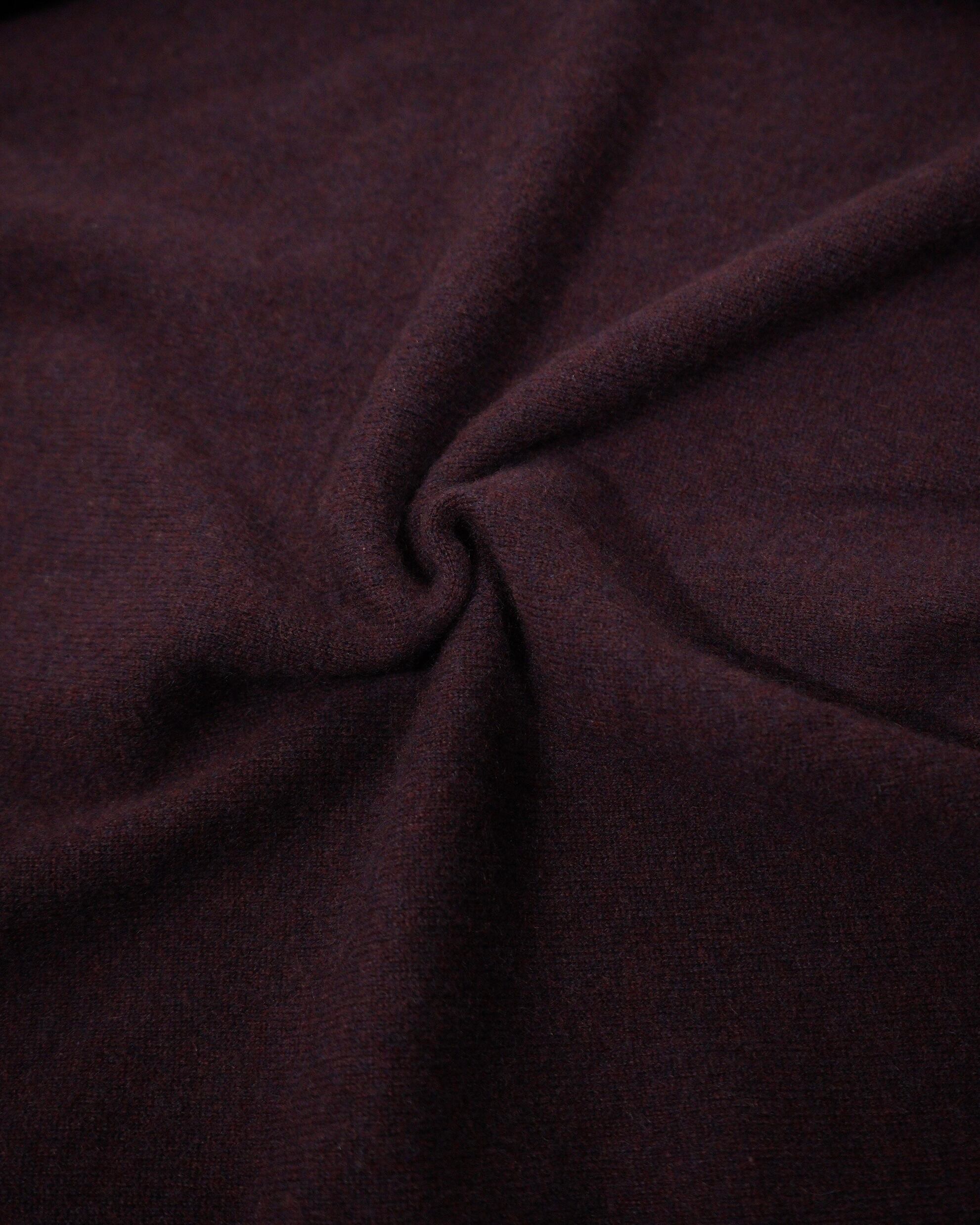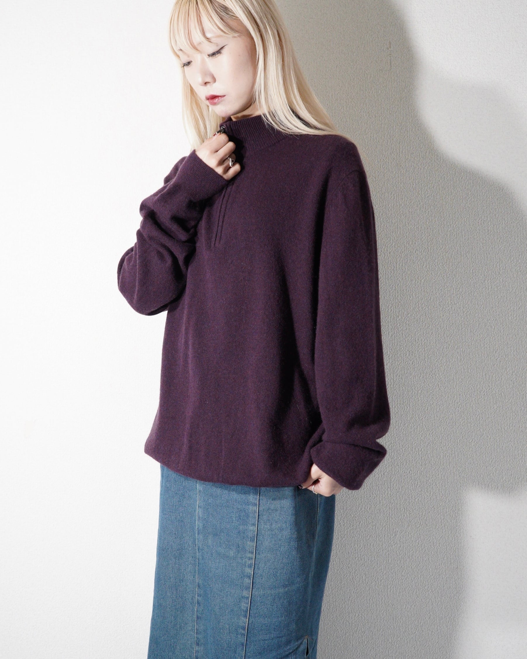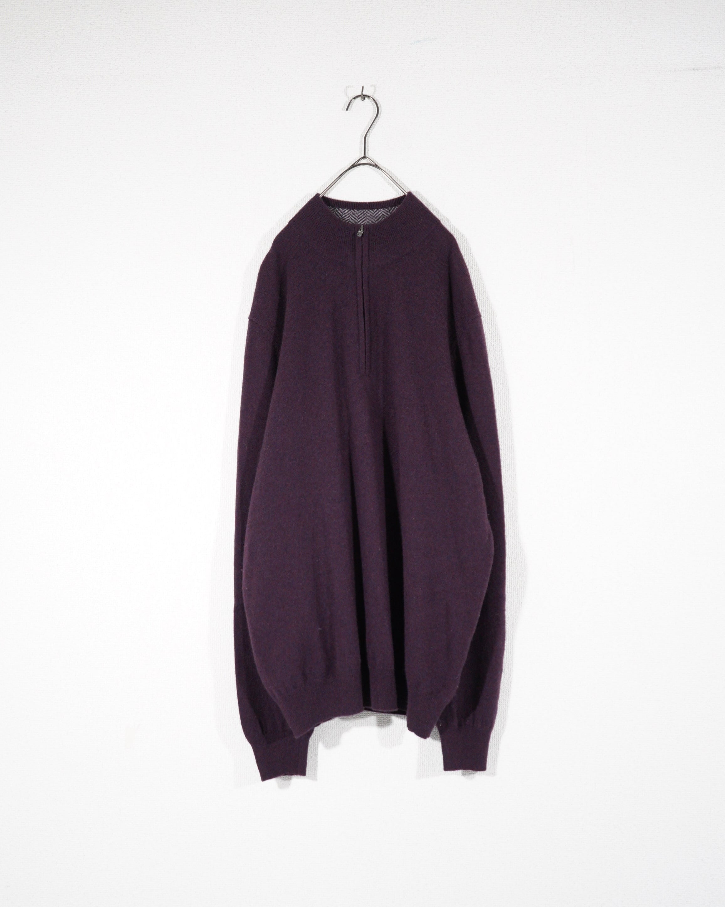 バーガンディカラーのハーフジップカシミヤ。