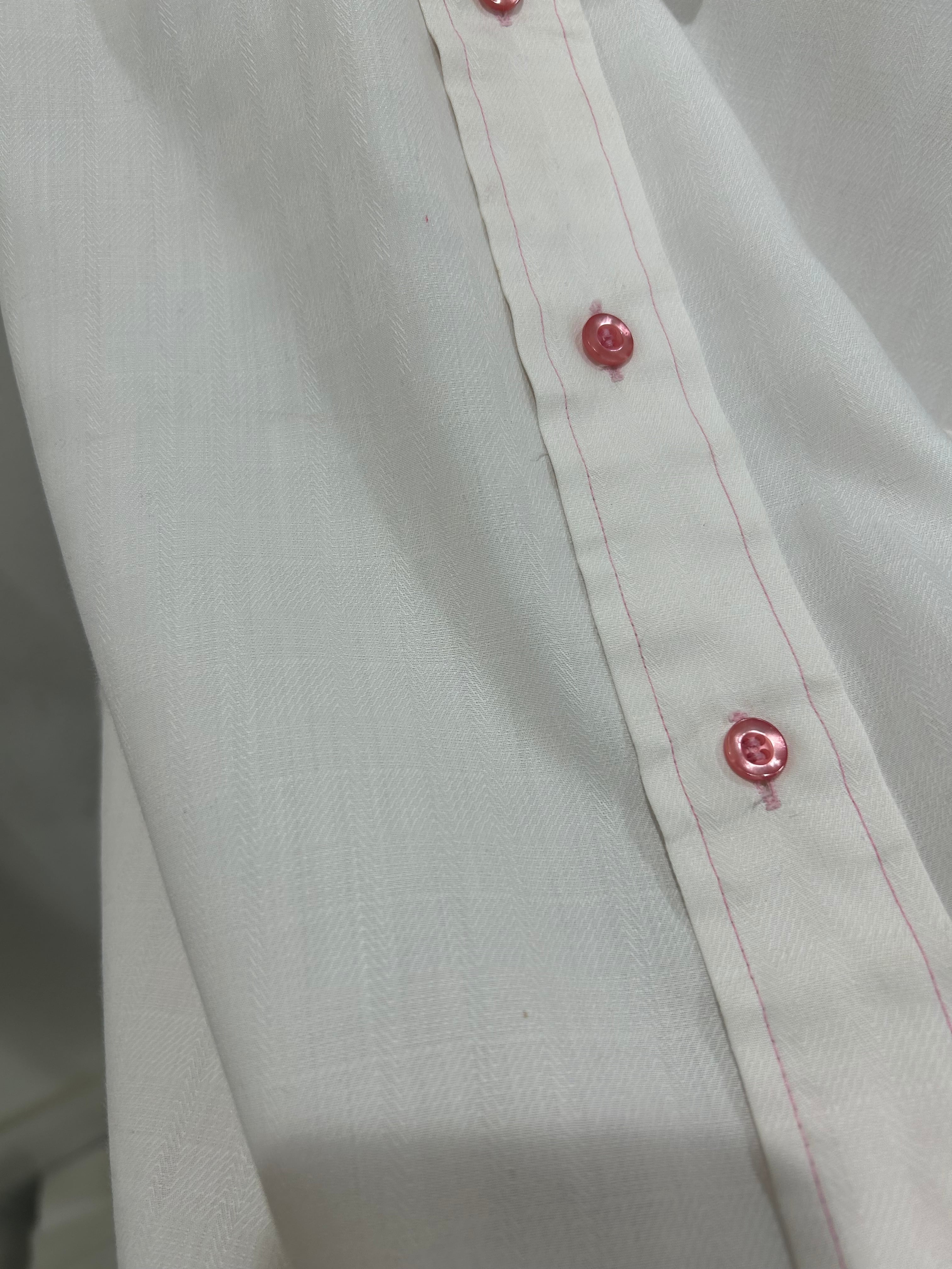 ステッチやボタンもピンクで統一されていて、春らしい優しい雰囲気の一枚です。