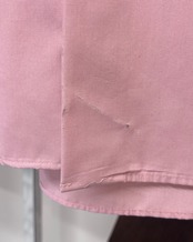 裾にダメージ。またバック襟に若干の浮きがございます。