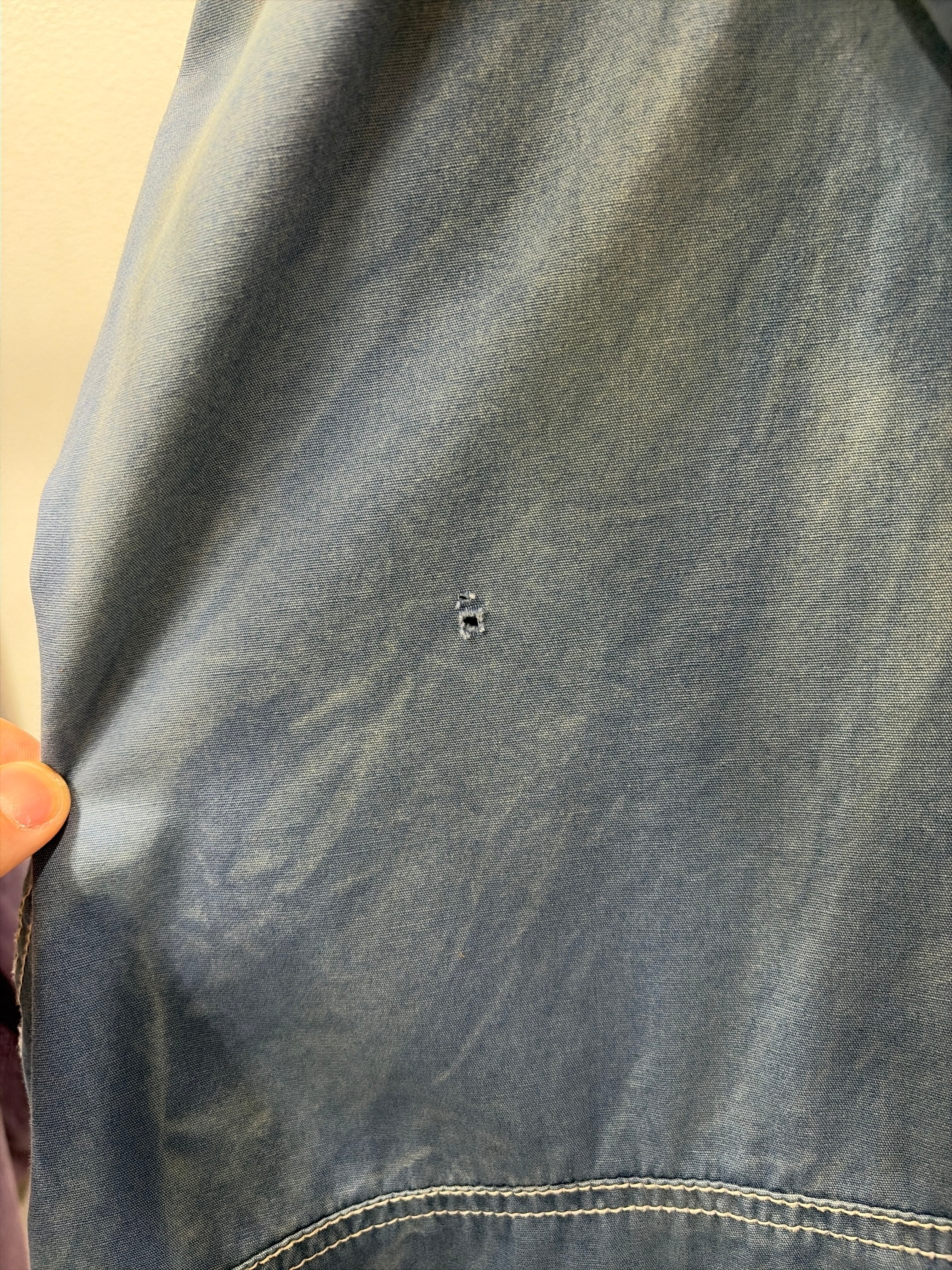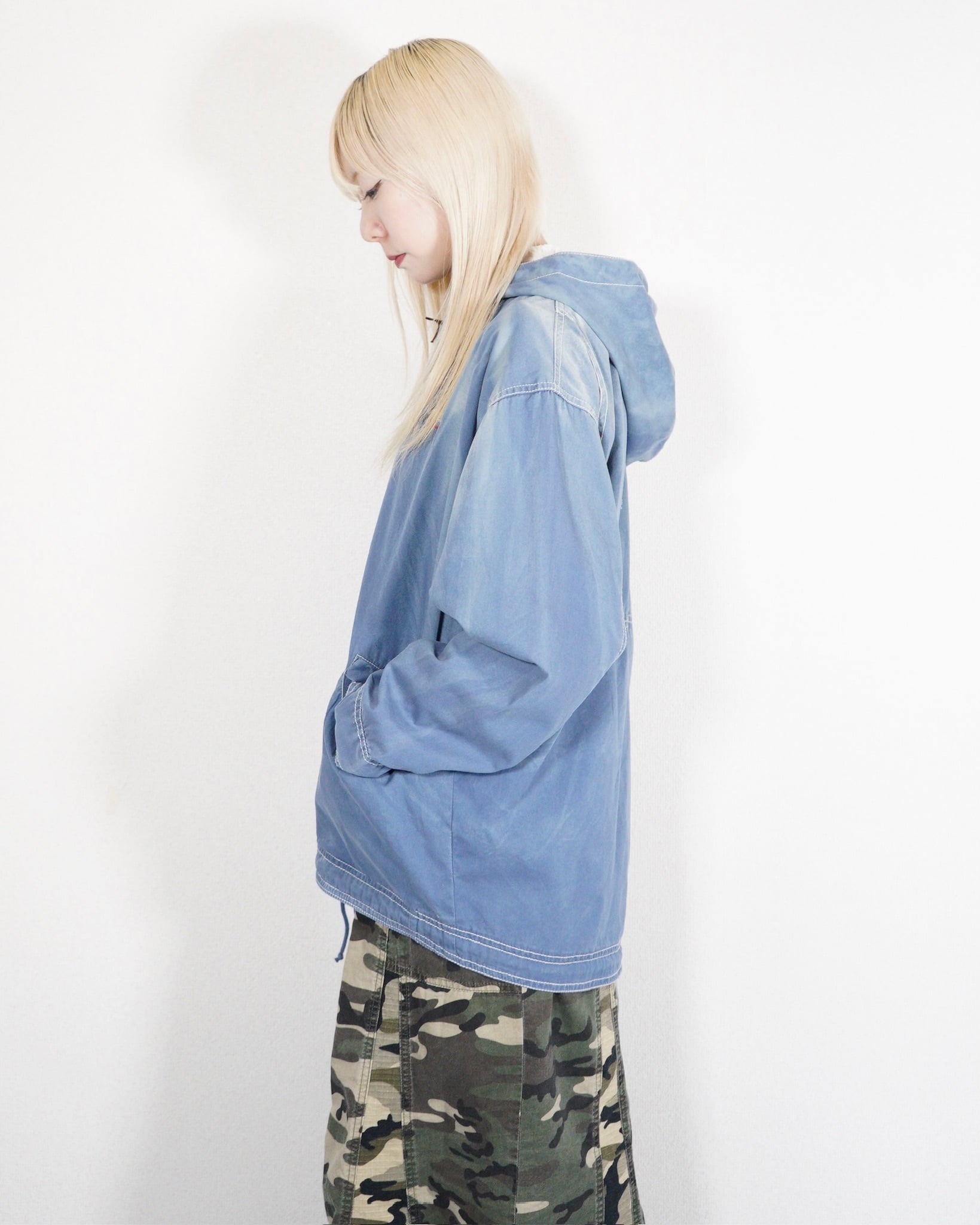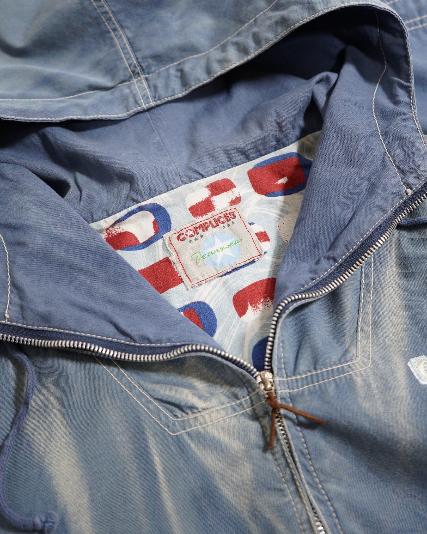 こちらはウォッシュのかかったコットンフーディー。フェードしたブルーの色味にステッチワークがたまりません。