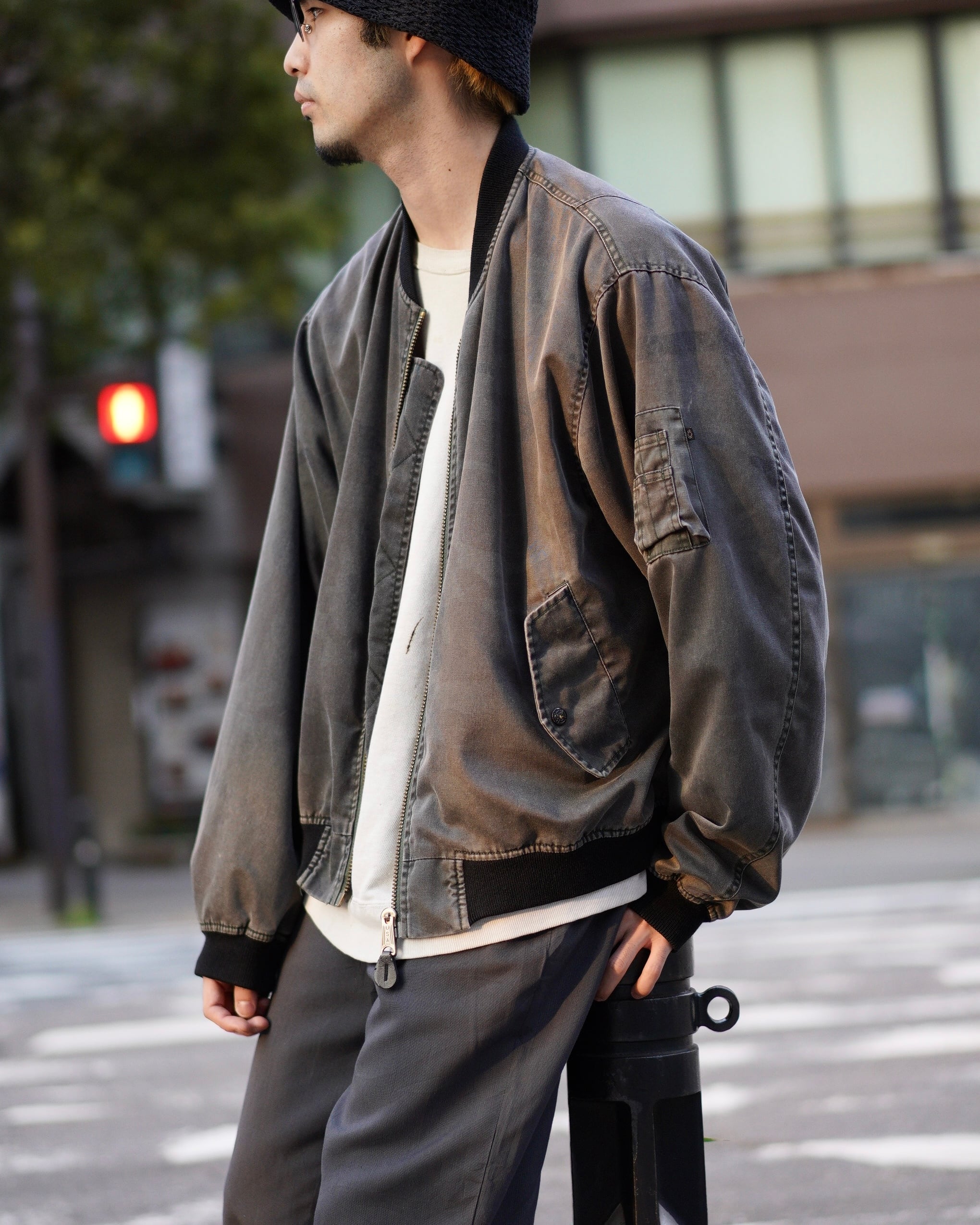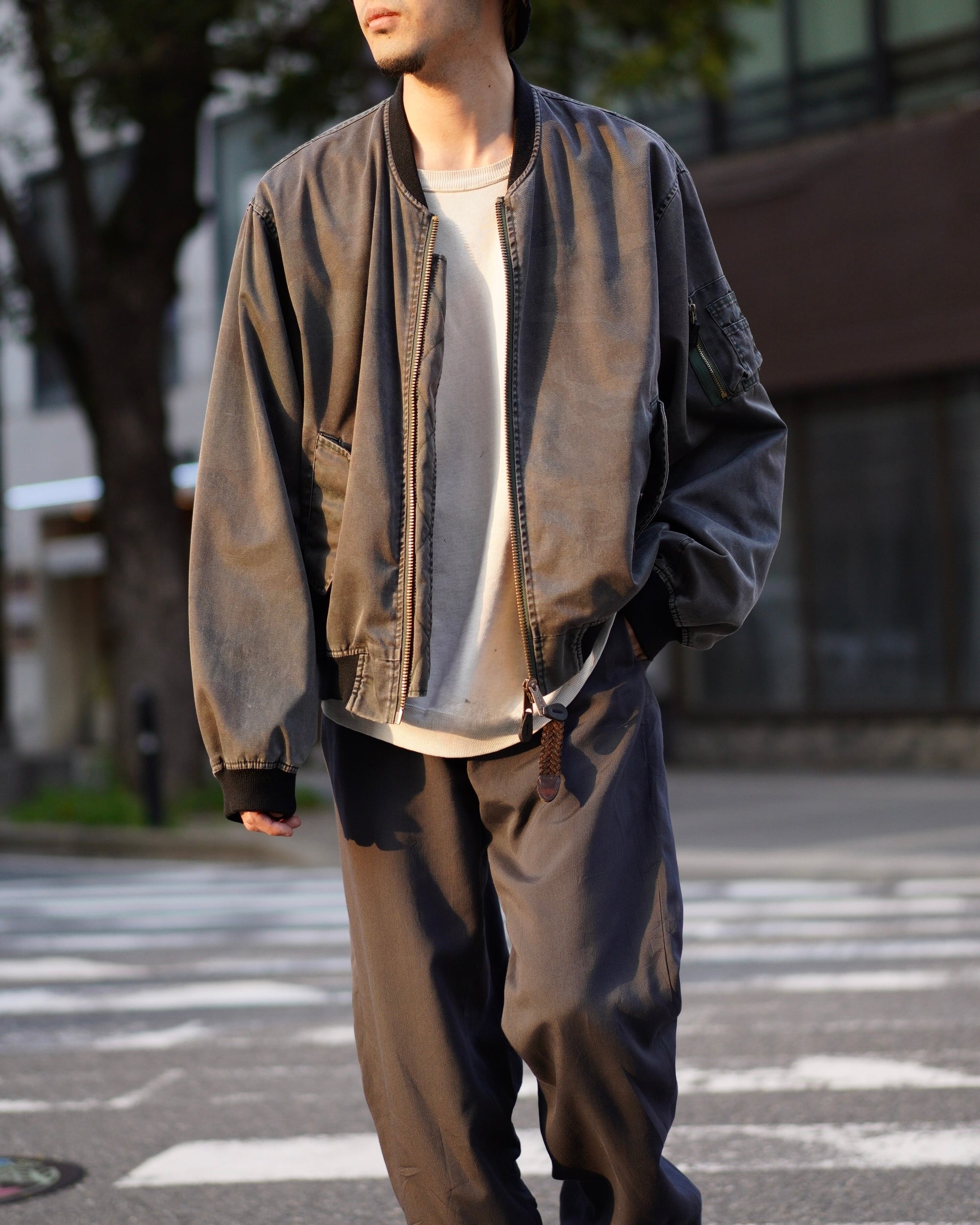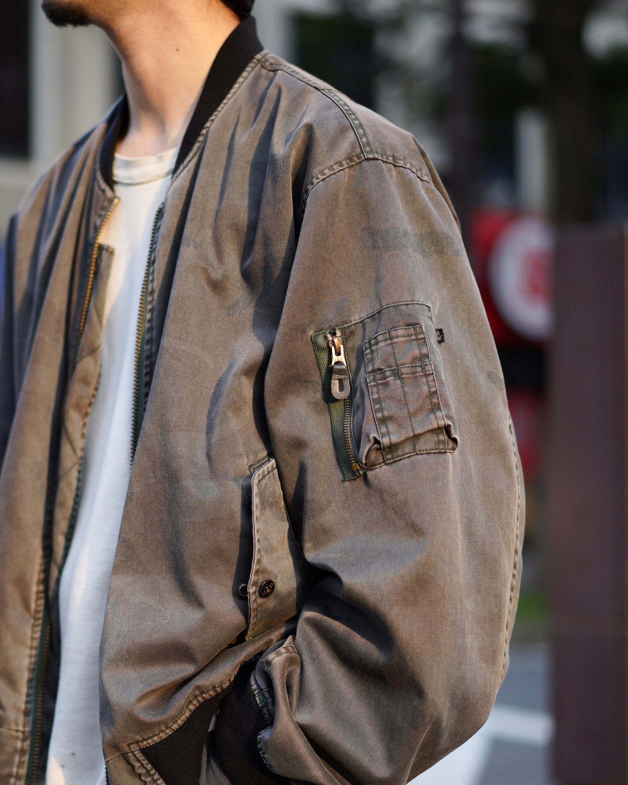 シグネチャー的な立ち位置でもあるMA-1ですが、こちらの個体はガーメントダイ仕様になっており、よりモードな印象。