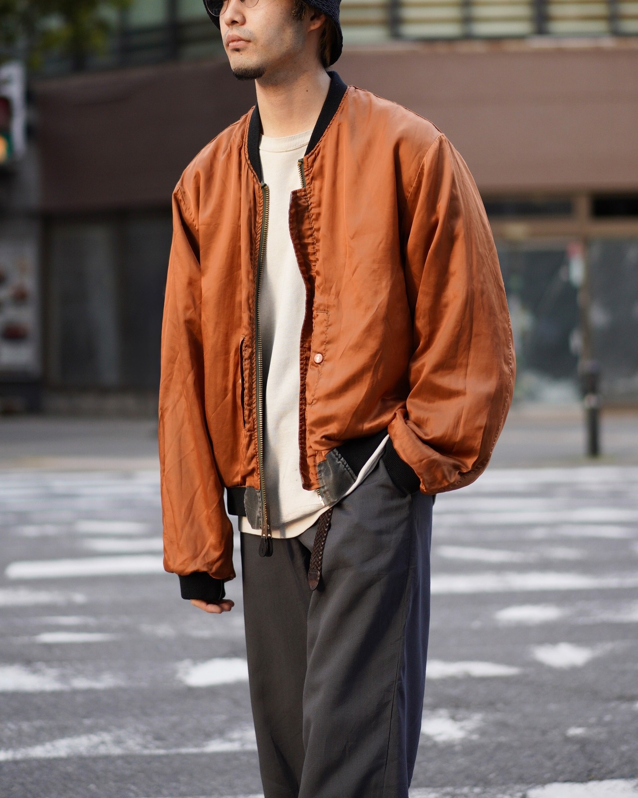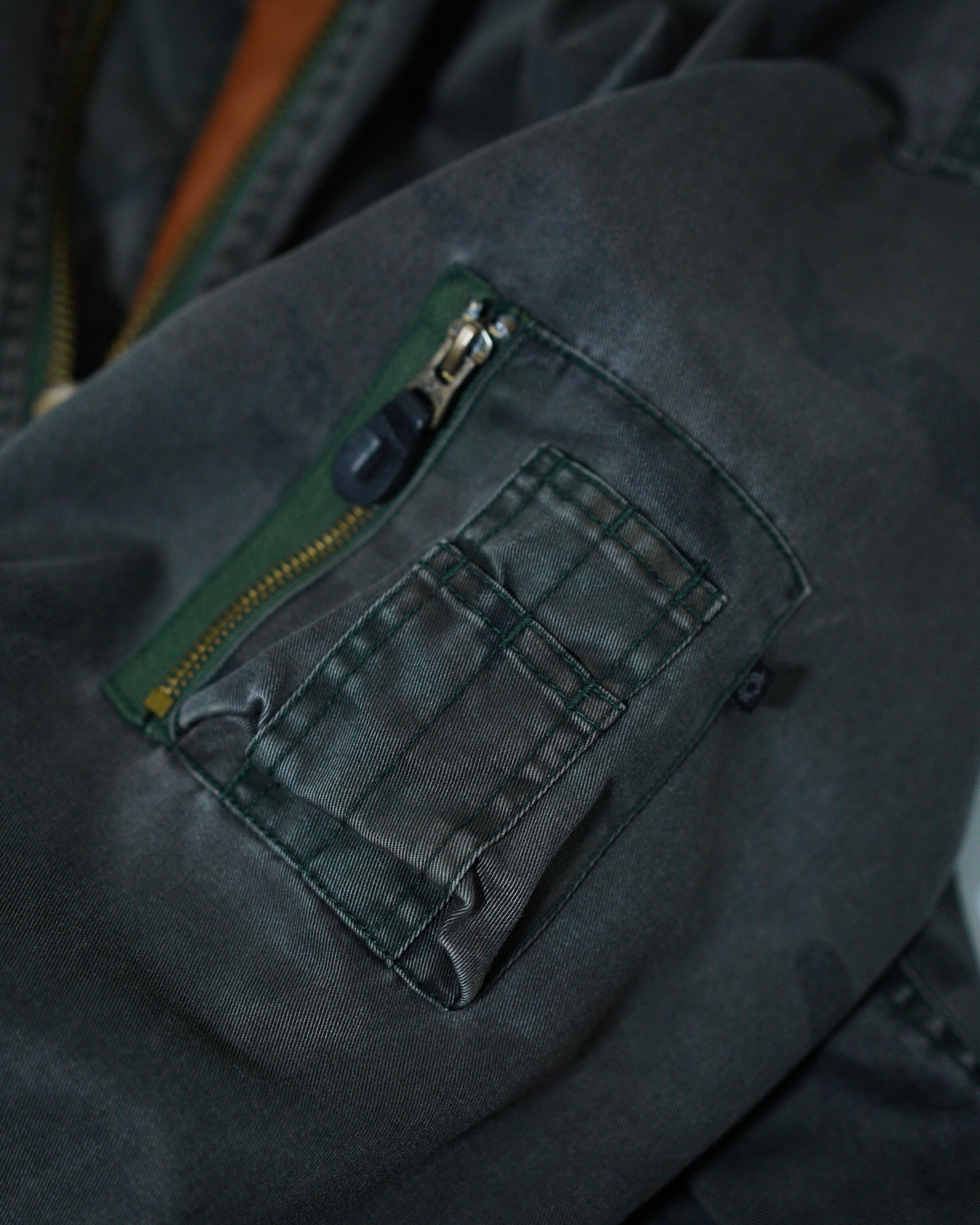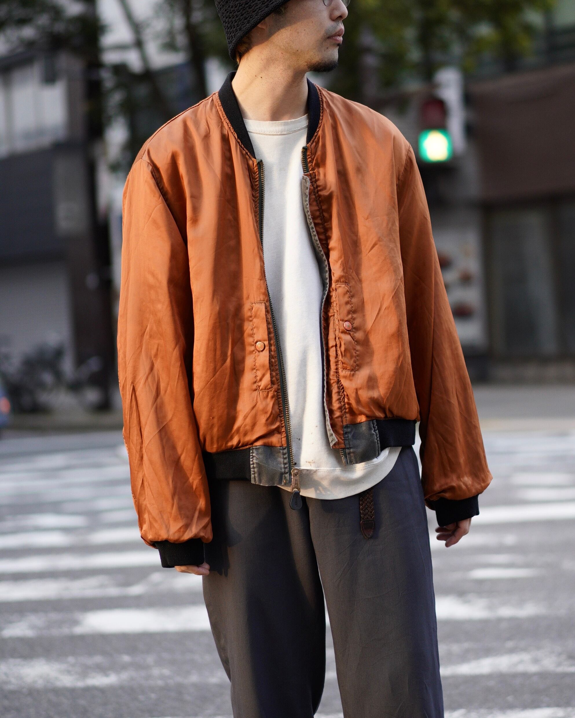 シグネチャー的な立ち位置でもあるMA-1ですが、こちらの個体はガーメントダイ仕様になっており、よりモードな印象。