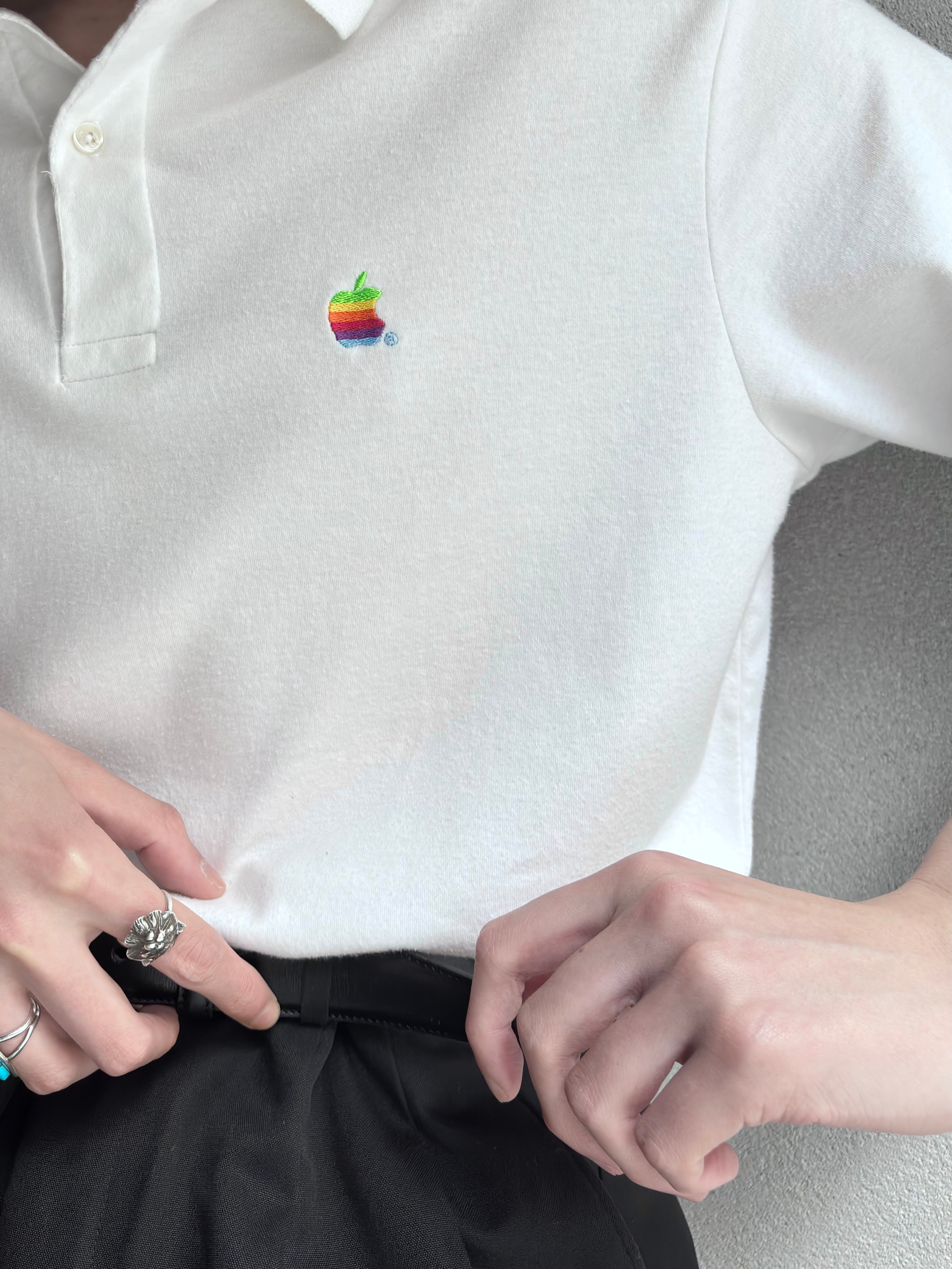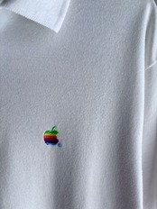 製品としては非常にシンプルなポロシャツですが、Appleの過去とカルチャーが凝縮されたような一着。白地のベーシックな見た目だからこそ、胸元には拘りたくなるのではないかと考えます。