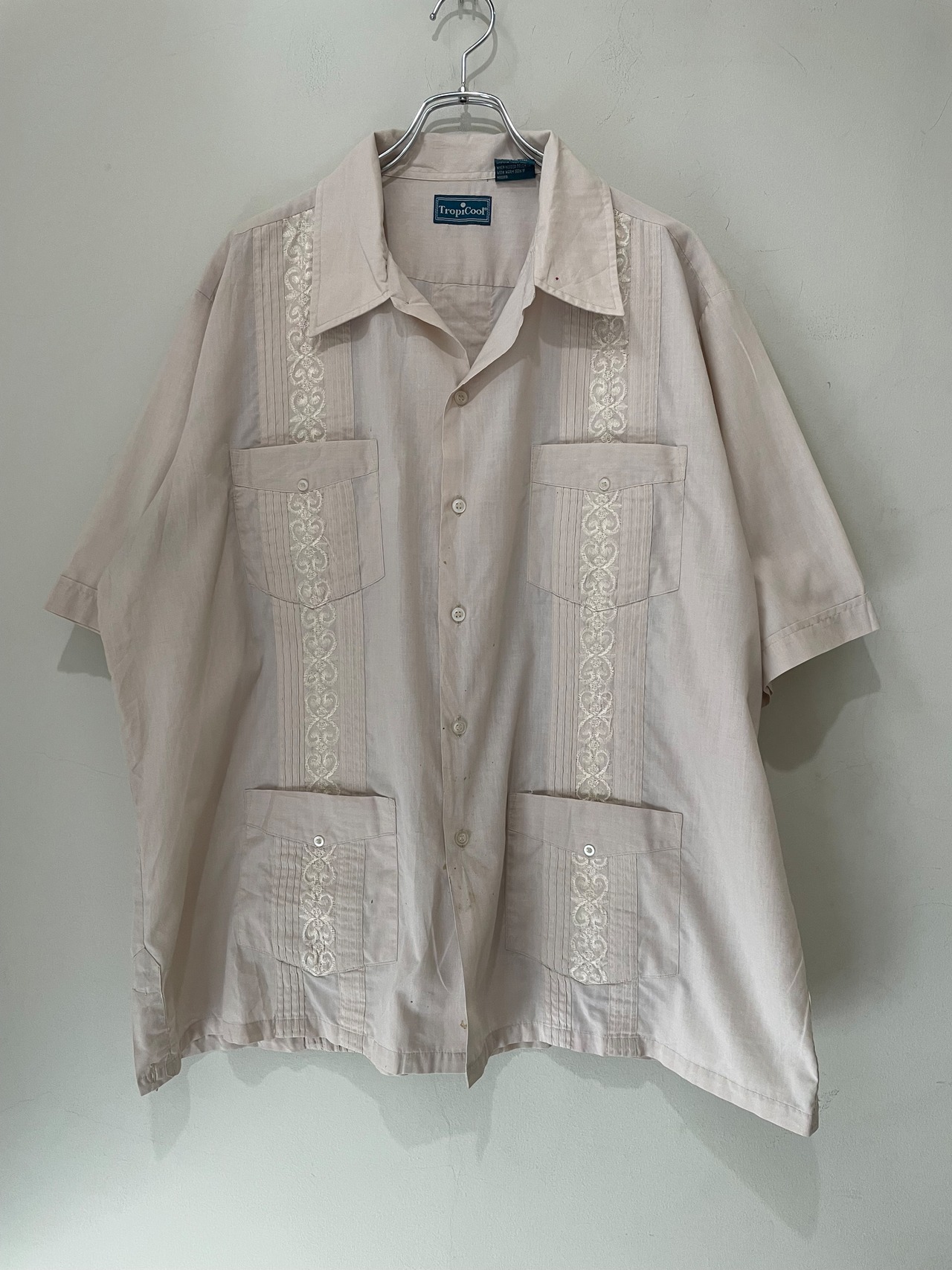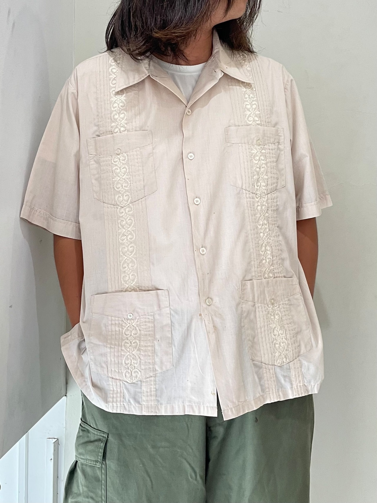 キューバの冠婚葬祭などで着られる正装のシャツ。白や黒が多い中でこちらは淡いピンクのような色味。