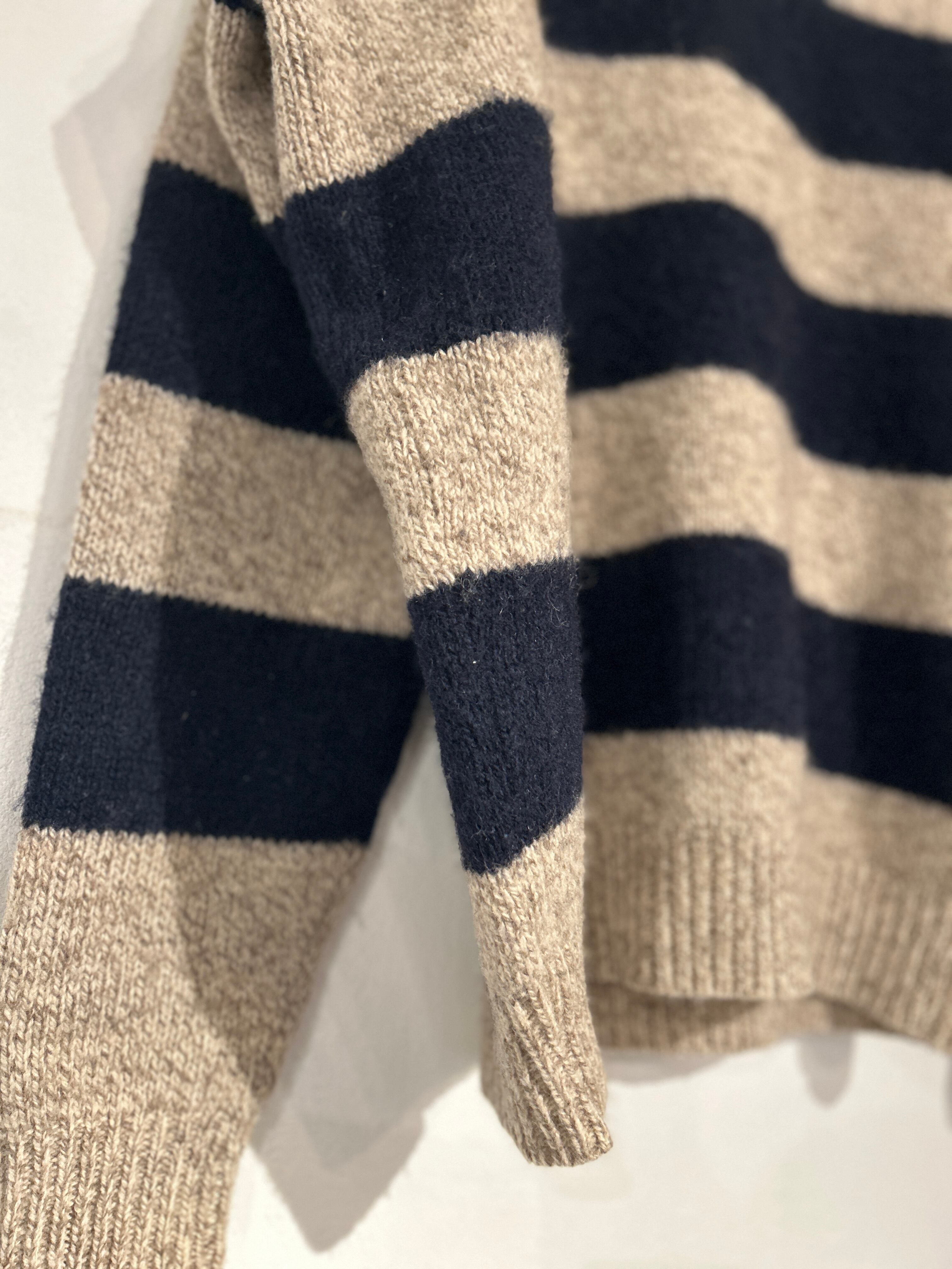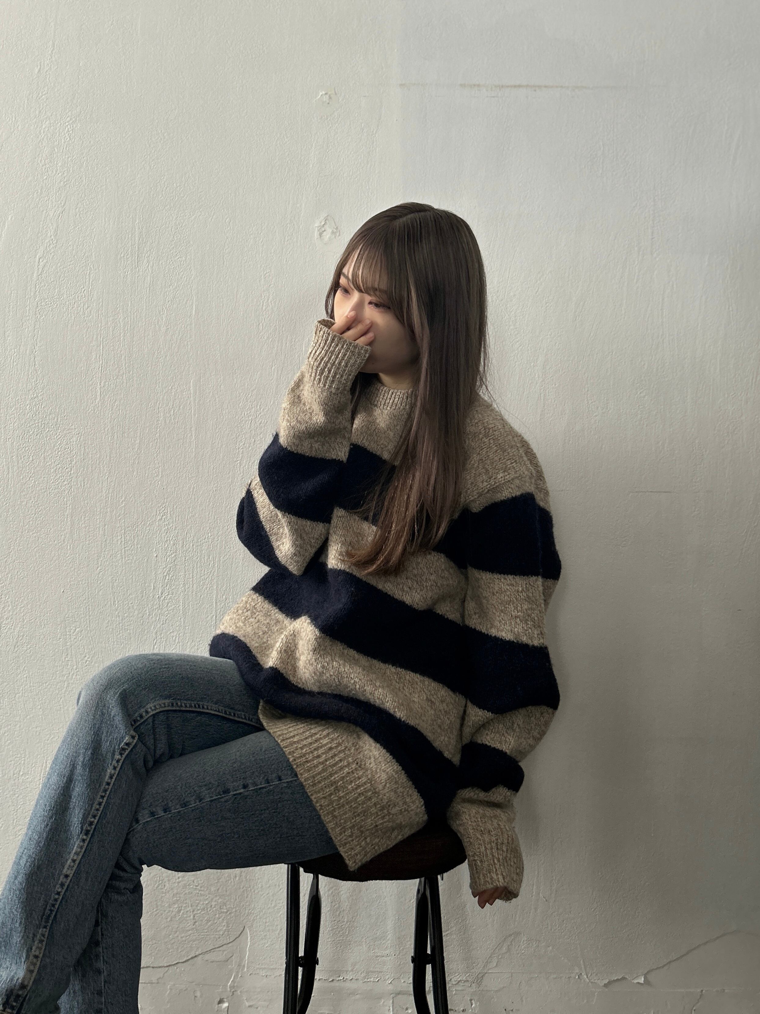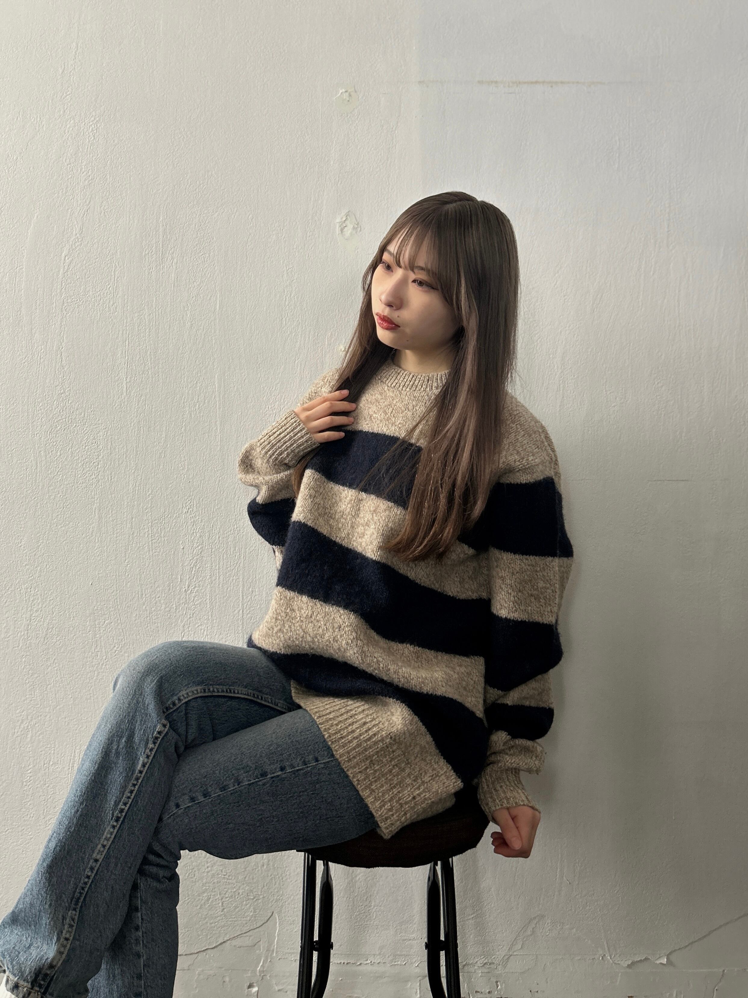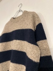 オートミールとネイビーカラーのボーダーニット。優しいカラーリングなので印象がキツくならず、普段使いしやすいデザインです。