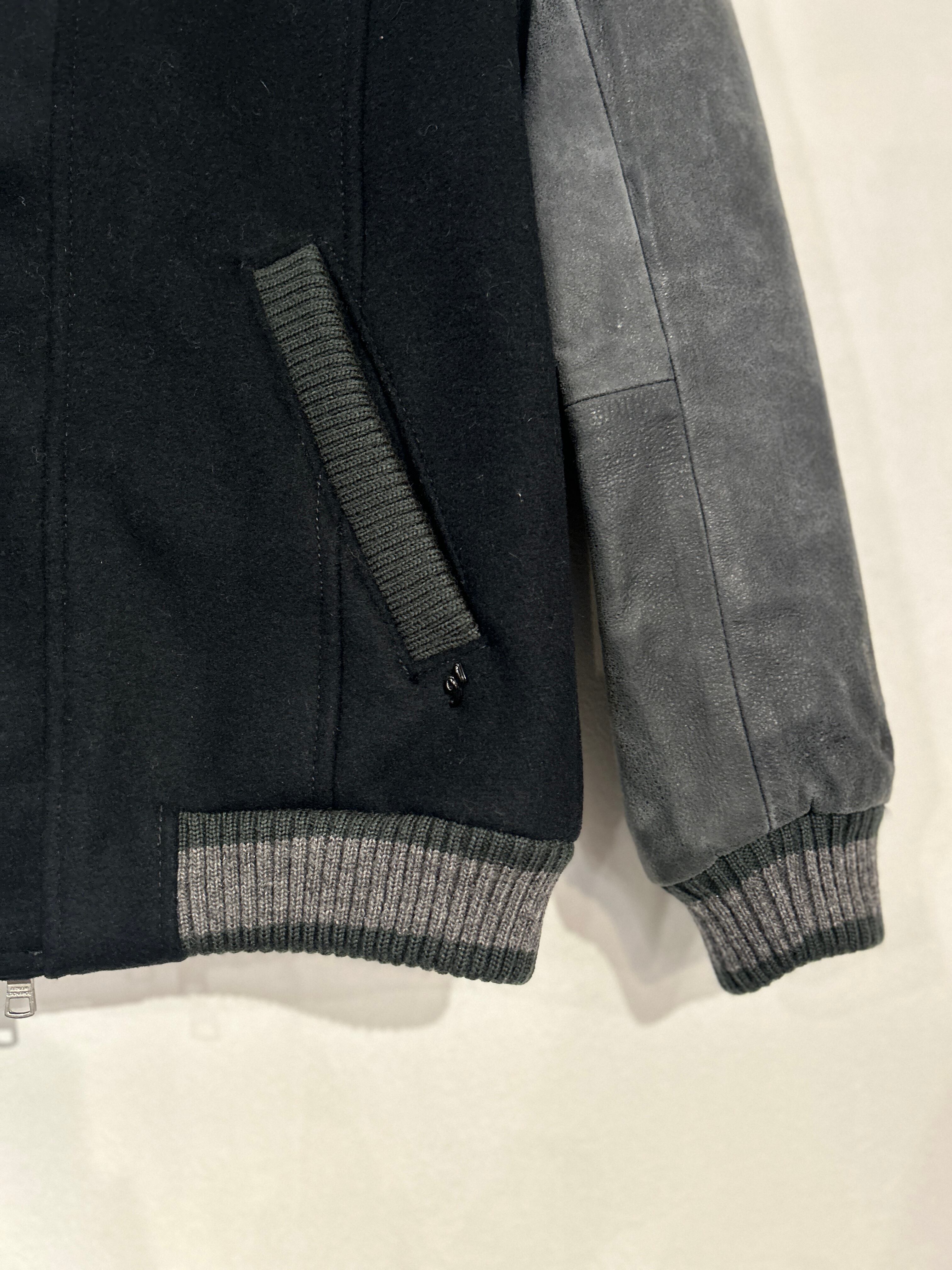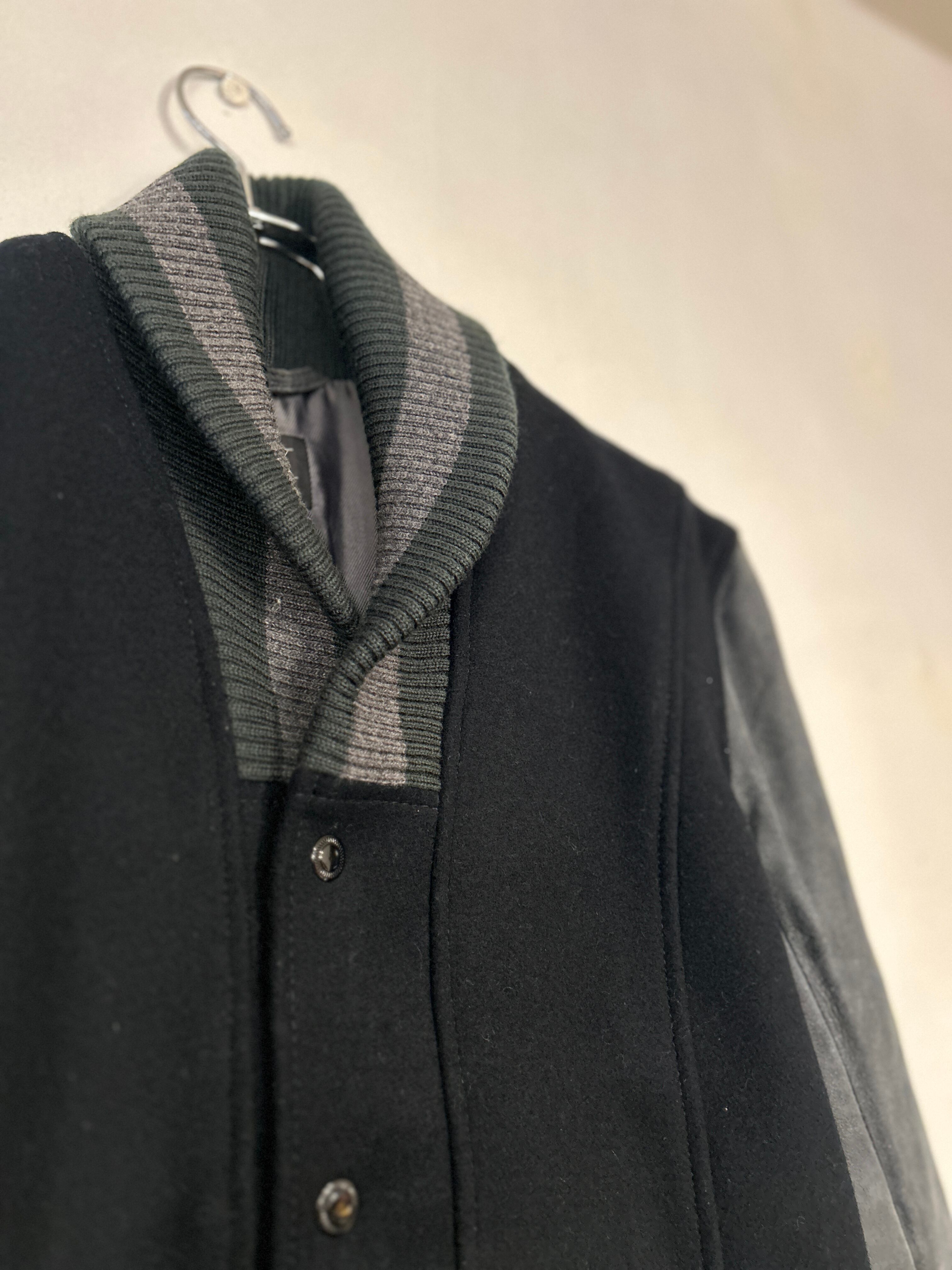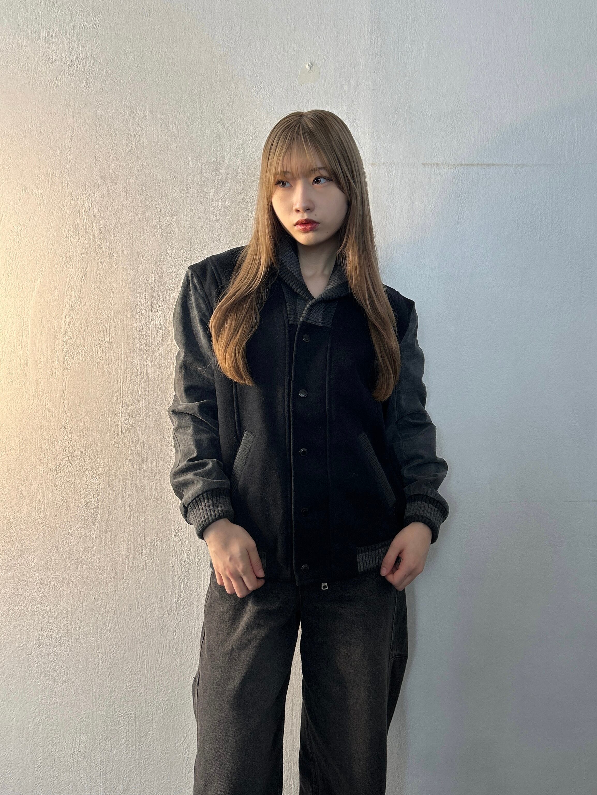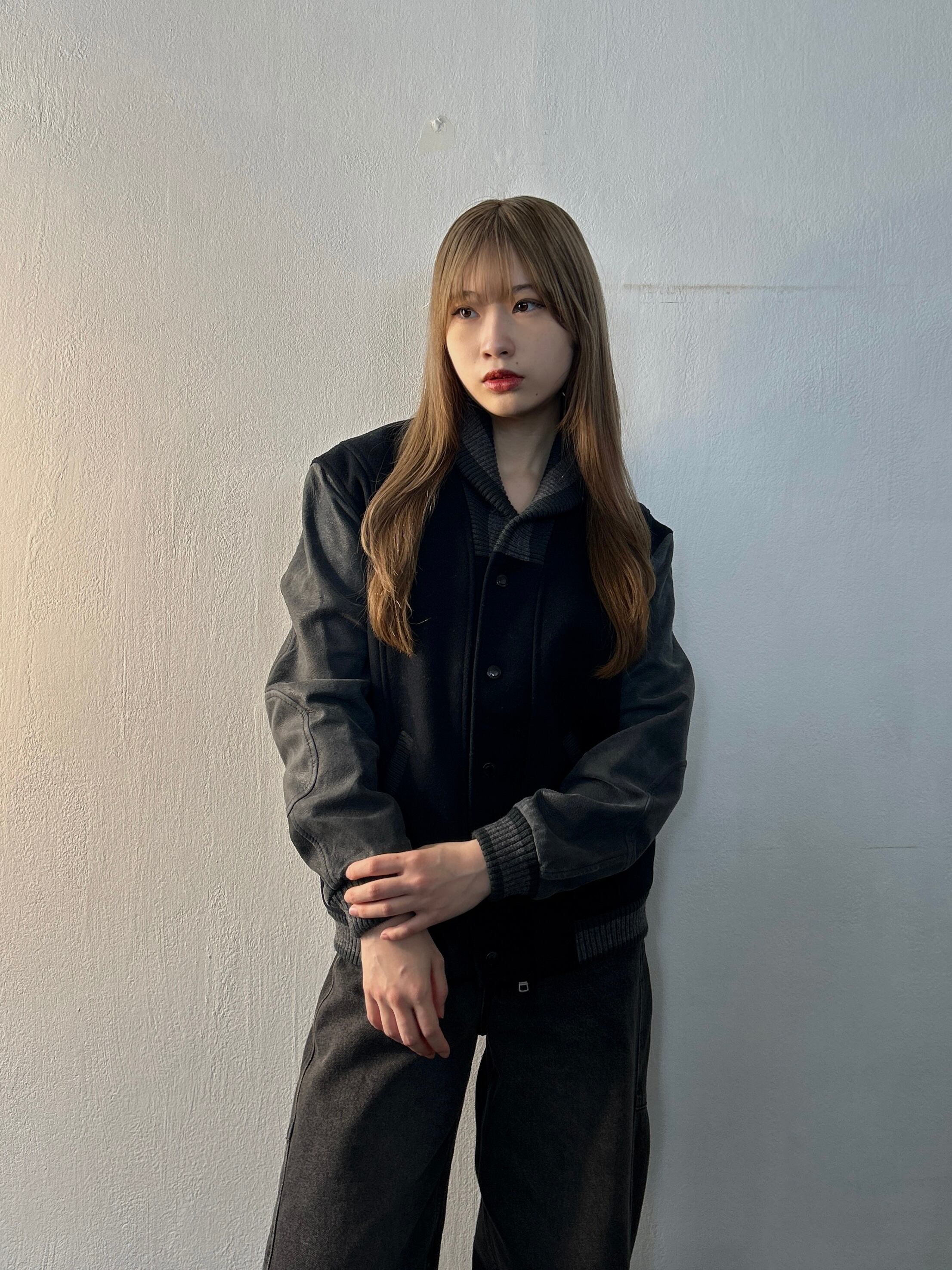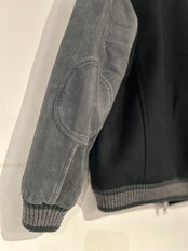 ショールカラーが特徴的なスタジアムジャケット。ジャストに着られるサイズ感と、スリーブのスエード生地が相まって、クールで上品な印象になります。