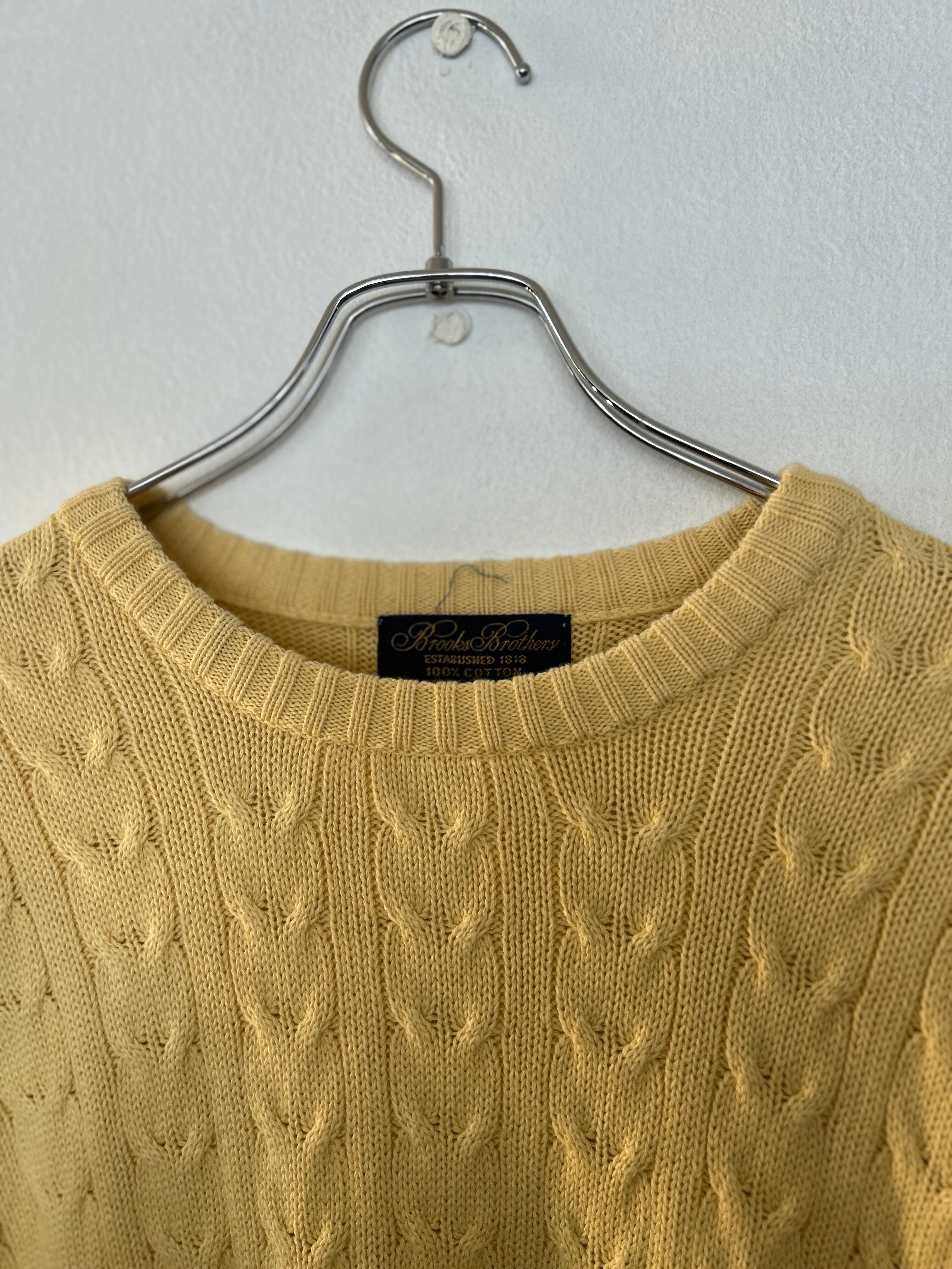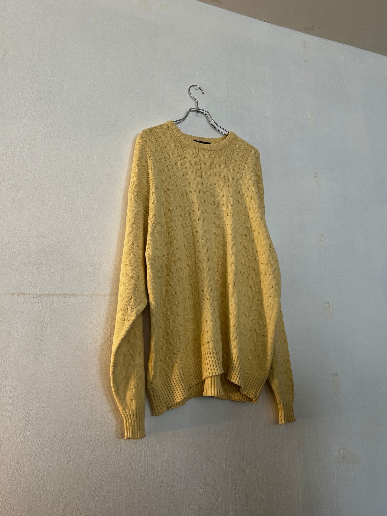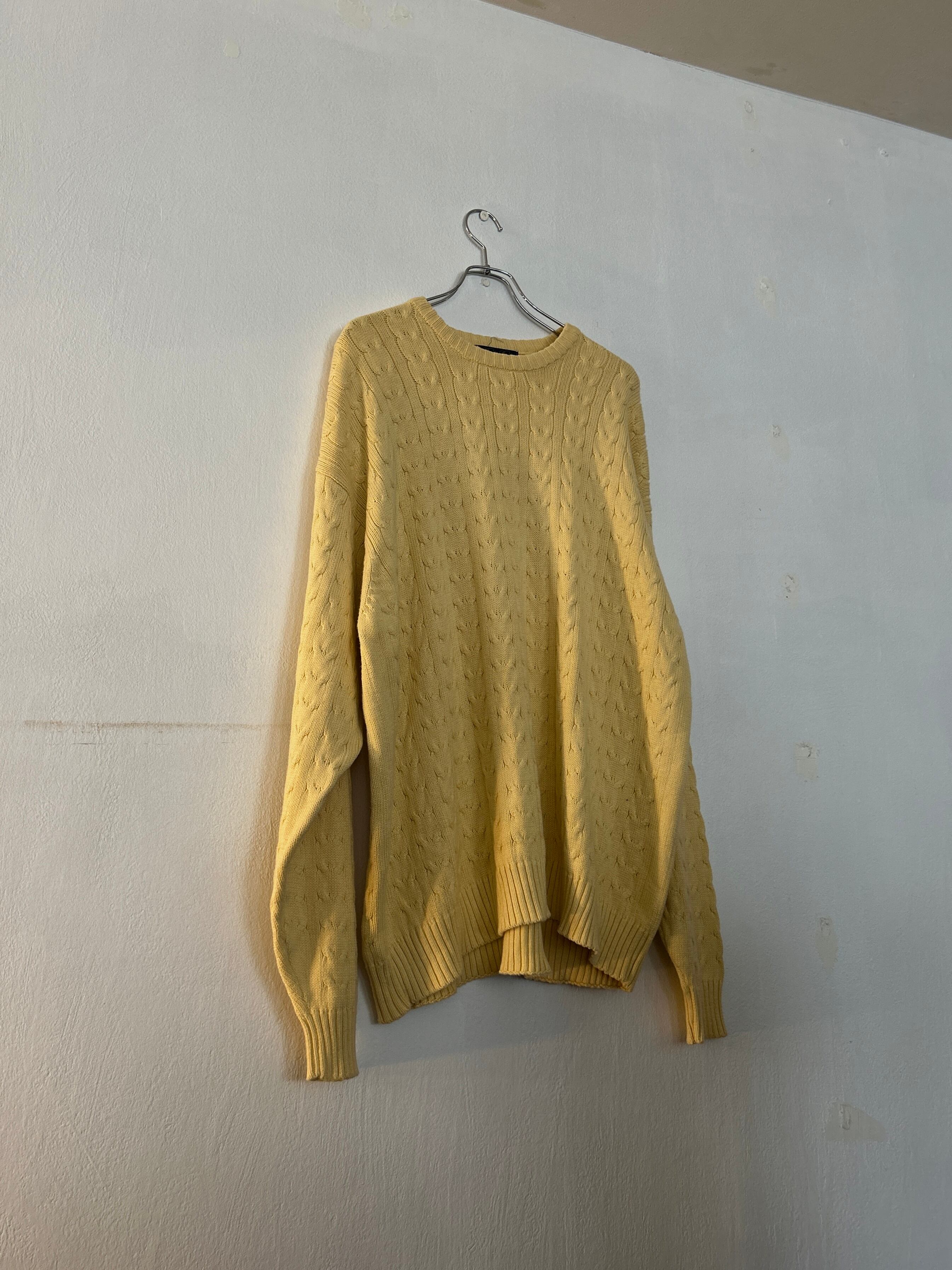 こちらは柔らかいイエローカラーのケーブル編みニット。100%コットンで静電気が起きにくいところもポイントです。