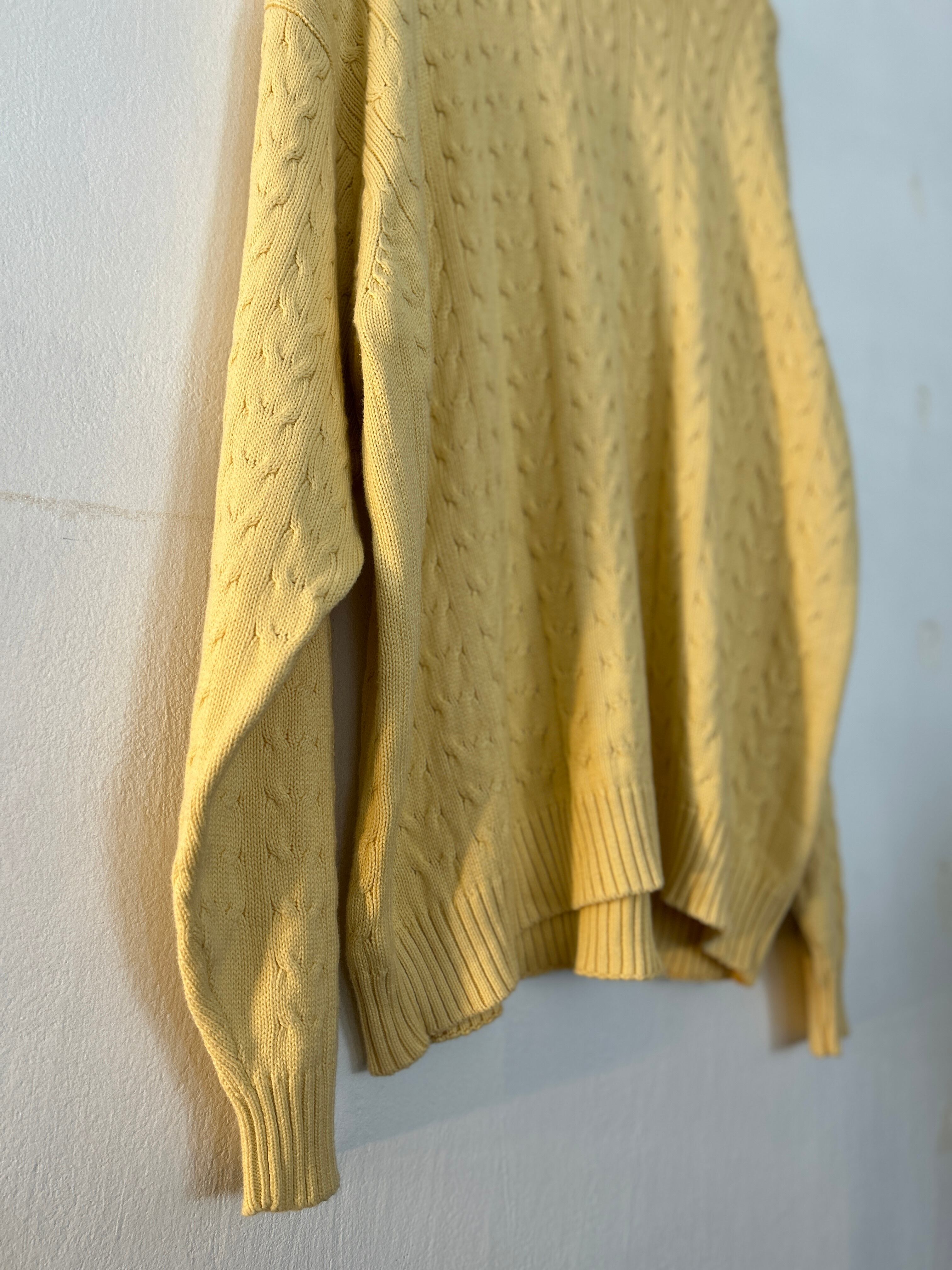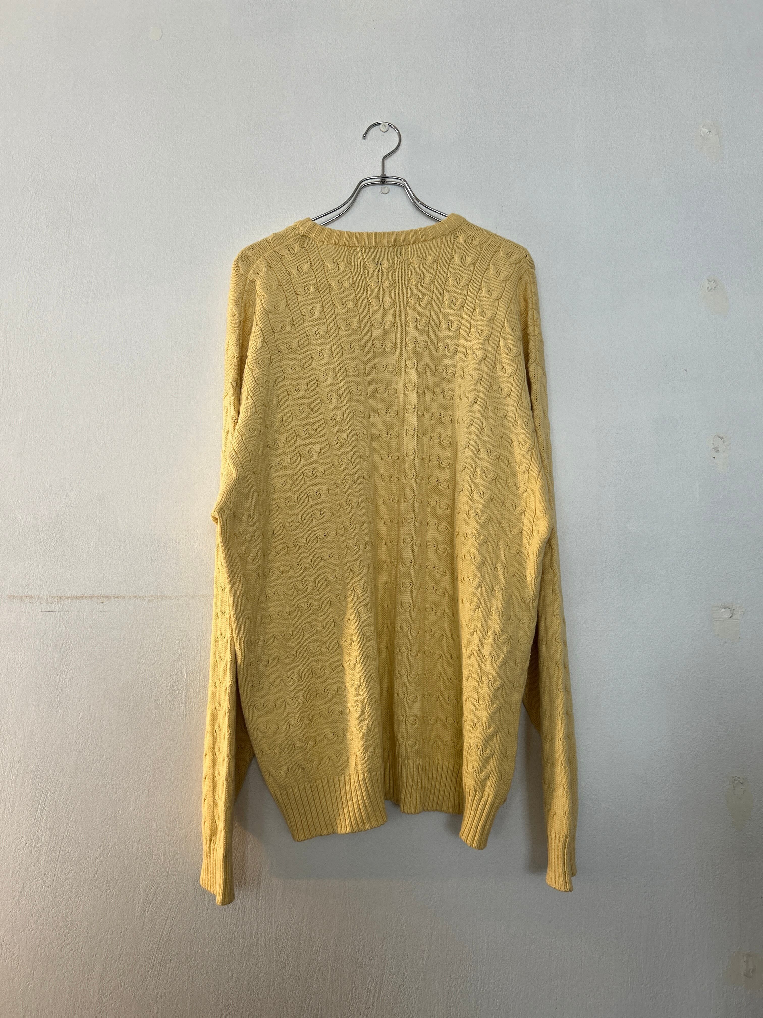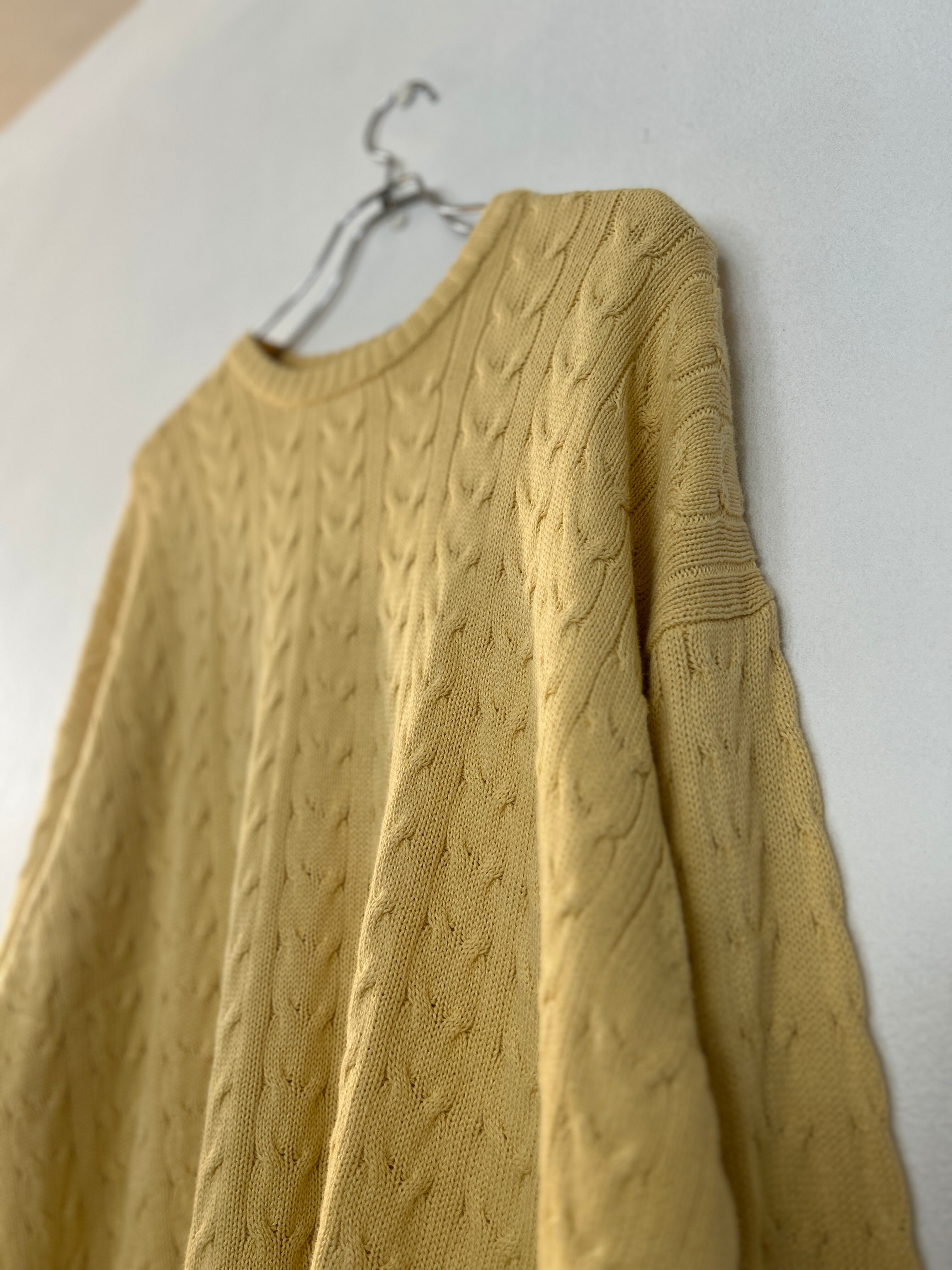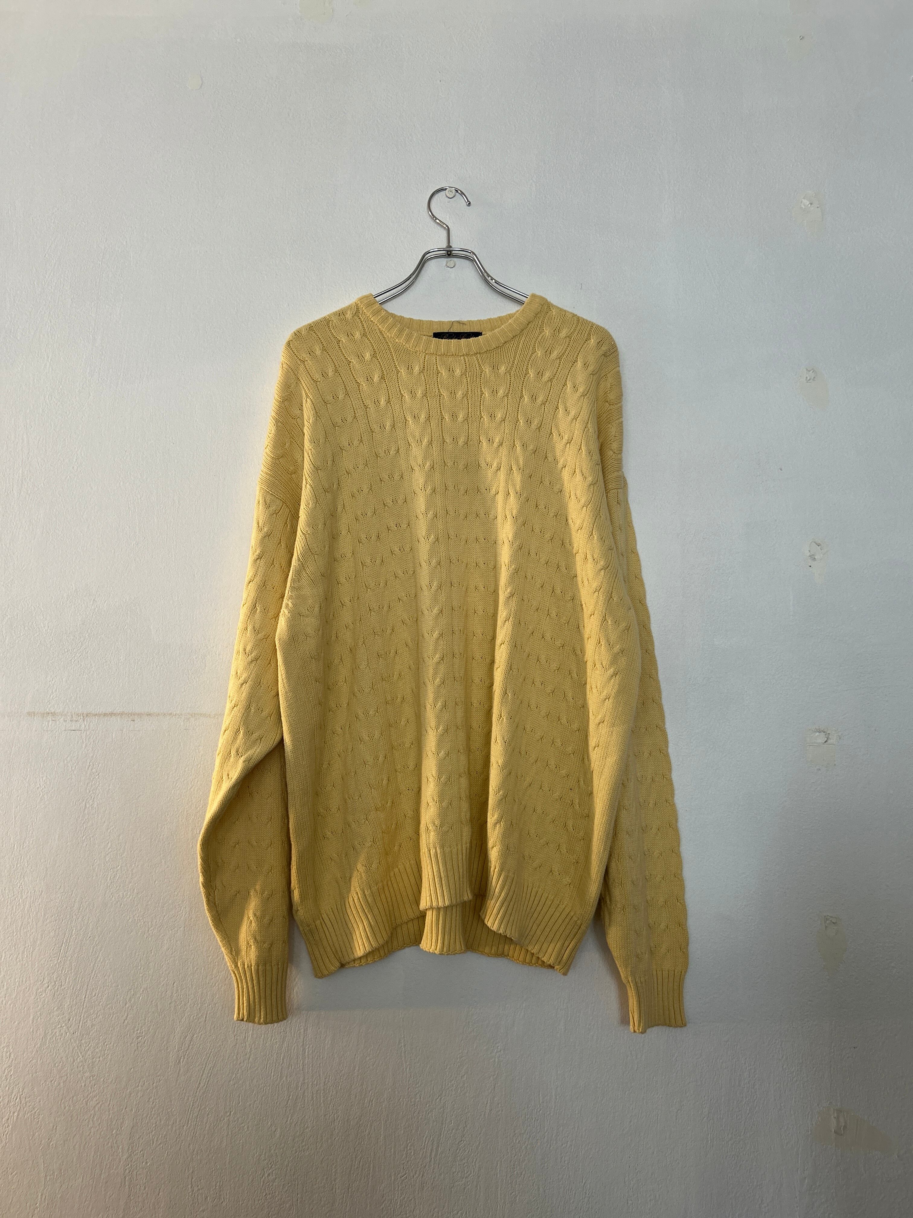 こちらは柔らかいイエローカラーのケーブル編みニット。100%コットンで静電気が起きにくいところもポイントです。